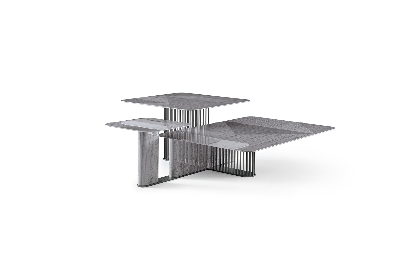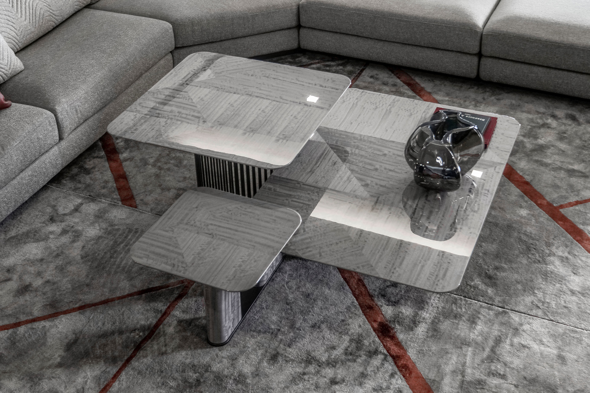 Three levels cocktail table with tops in inlaid Tasmanian curly Eucaliptus veneer with high gloss polyester finish. Base in combination of satin grey nickel stainless steel and Tasmanian curly Eucaliptus veneer with high gloss polyester finish.