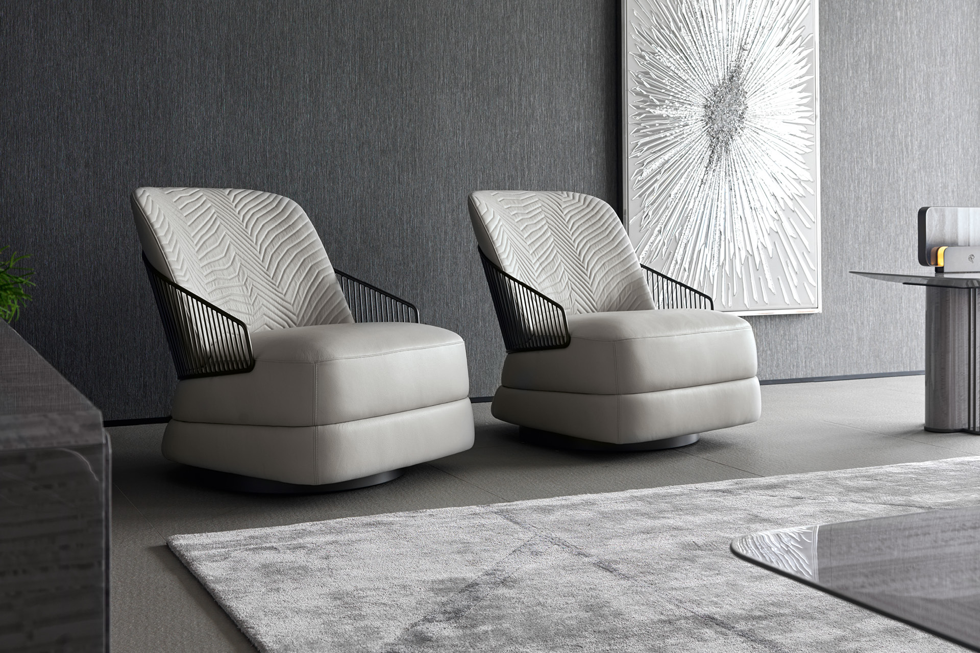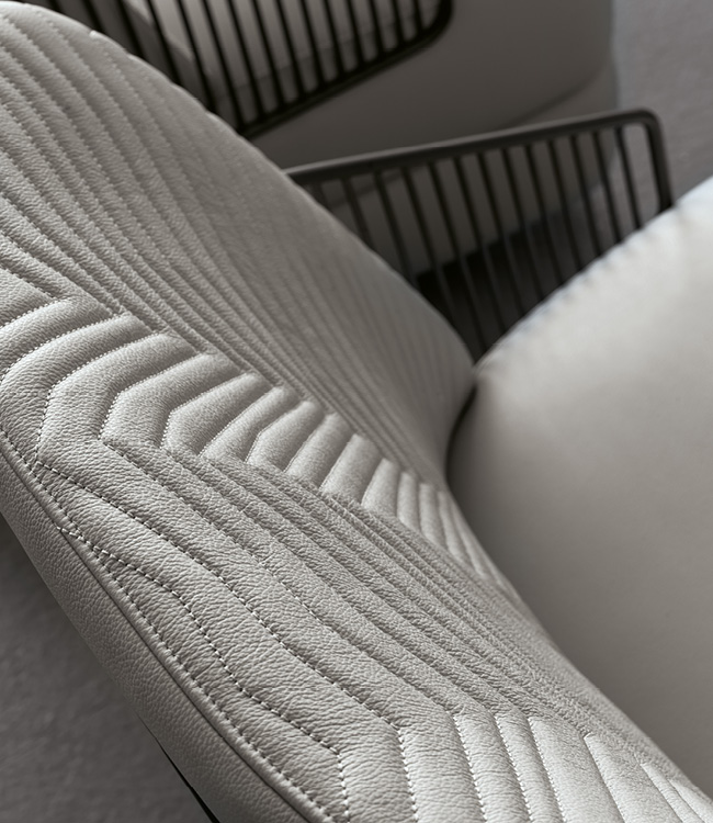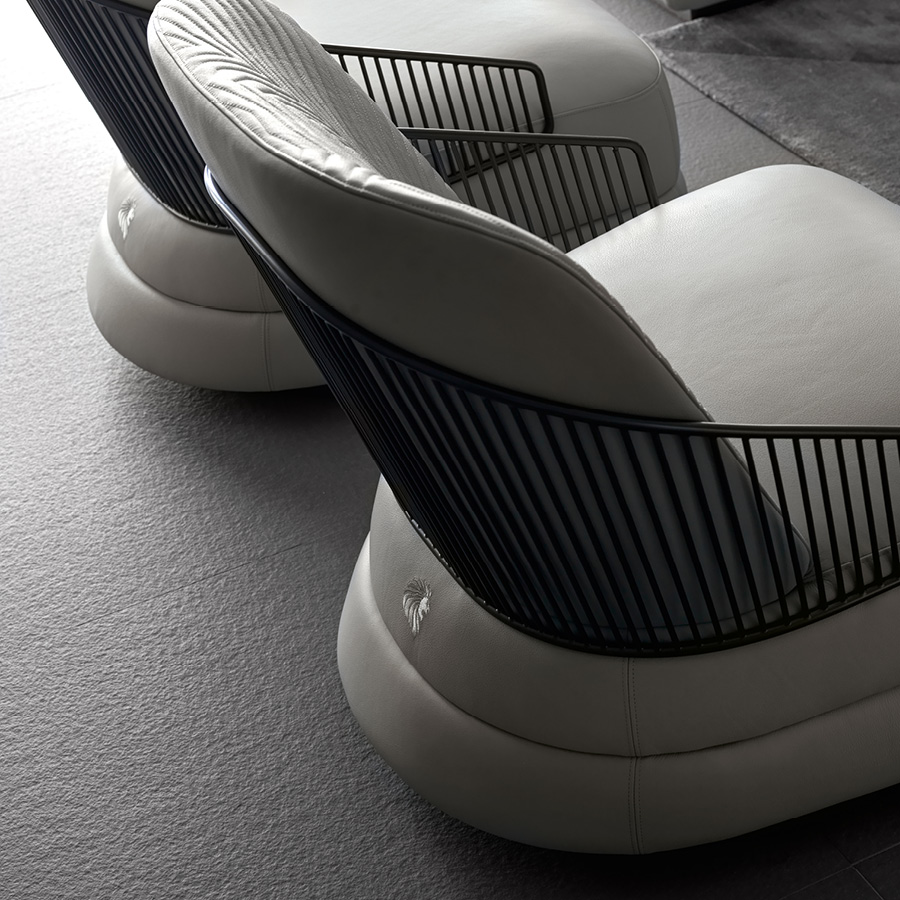 ccasional swivel chair available in first grade leather, nubuk leather, lizard printed leather, velvet or suede fabric. Chair seat and sides with double stitching in polyurethane foam wrapped in down feather. Quilted back with satin grey nickel stainless steel structure with embroidered Giorgio Collection logo on the base.