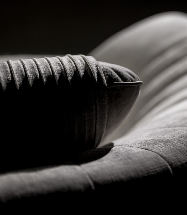 Fixed sofa with quilted fronts available in 3 big back pillows and base + frontal insert in light gold chrome stainless steel with Giorgio Collection logo. Sofa seats and sides with special stitching in polyurethane foam wrapped in down feather. Sofa armrests realized in quilted finish.