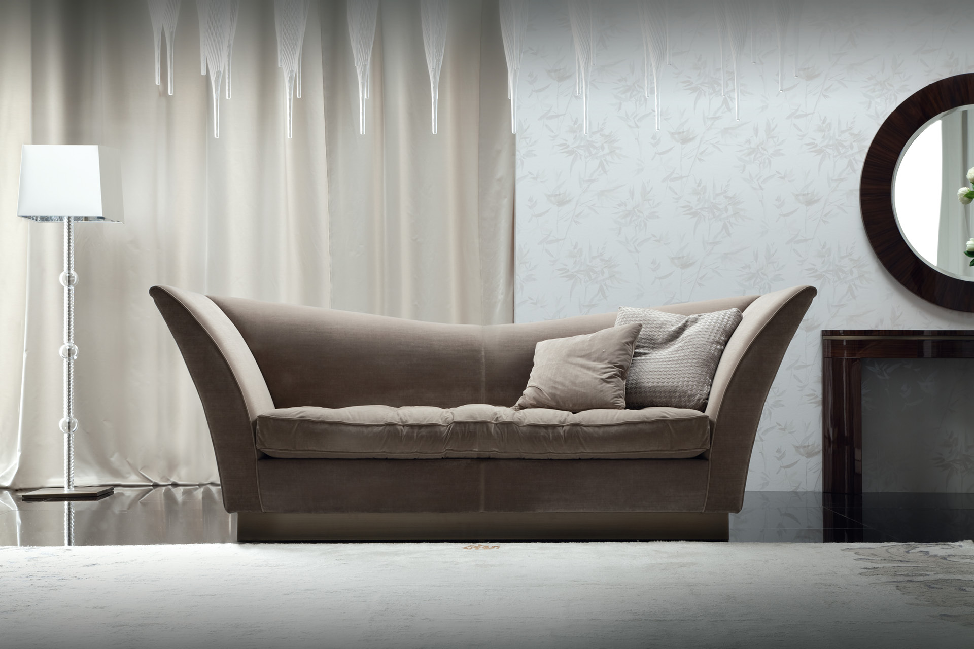 Fixed sofa with n. 2 seats and n. 2 throw pillow. Bronzed stainless steel base.