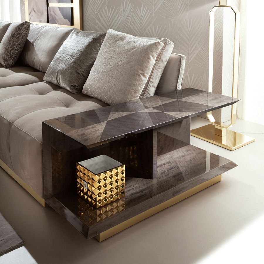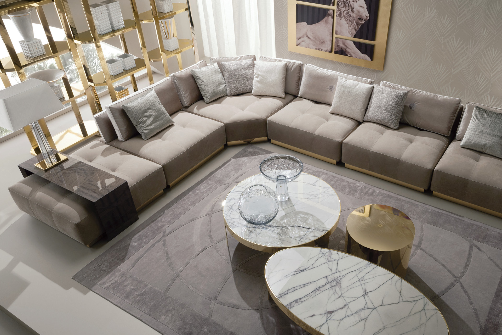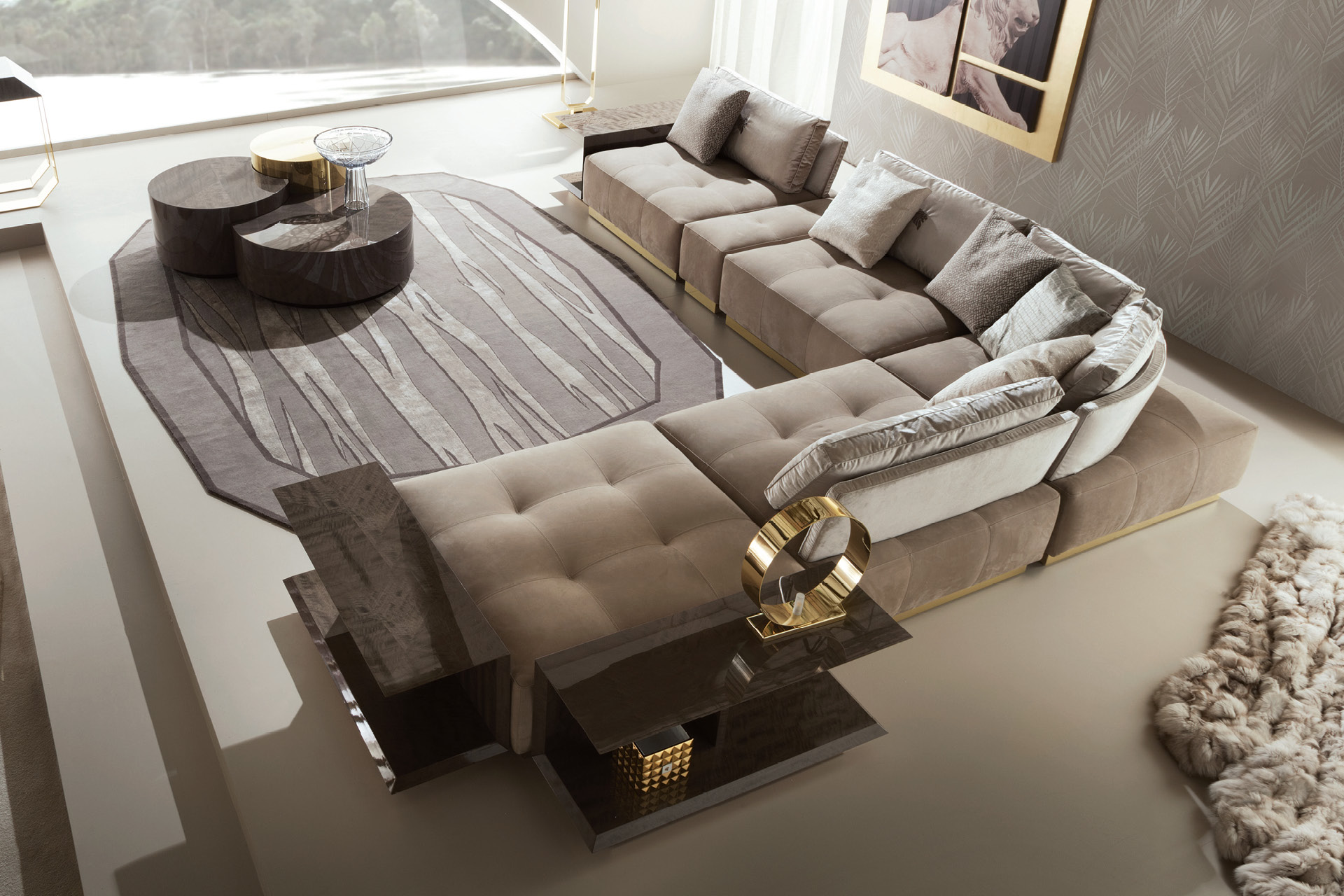 Infinity sectional sofa available in first grade leather, nubuk leather, lizard printed leather, velvet or suede fabric. Sofa seats and sides with double stitching in polyurethane foam wrapped in down feather. Base in light gold chrome stainless steel.