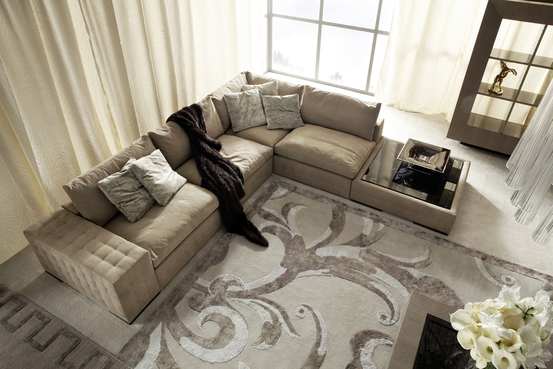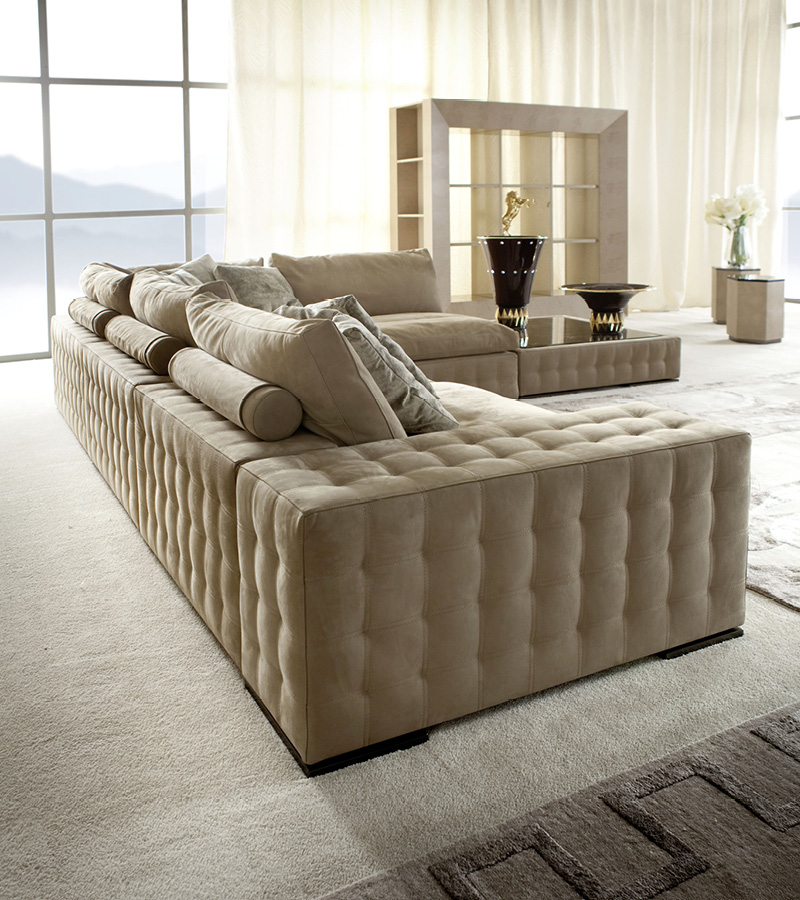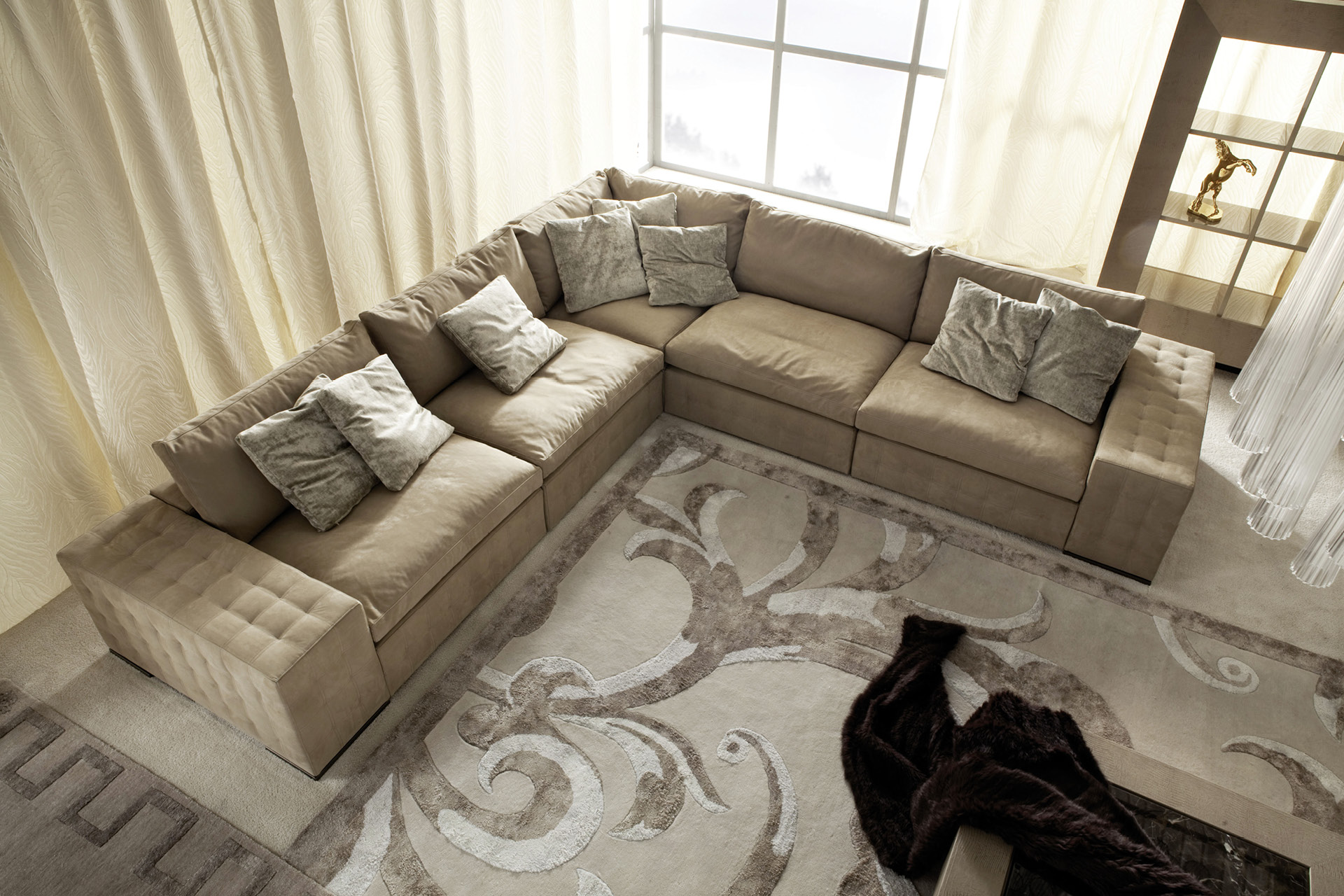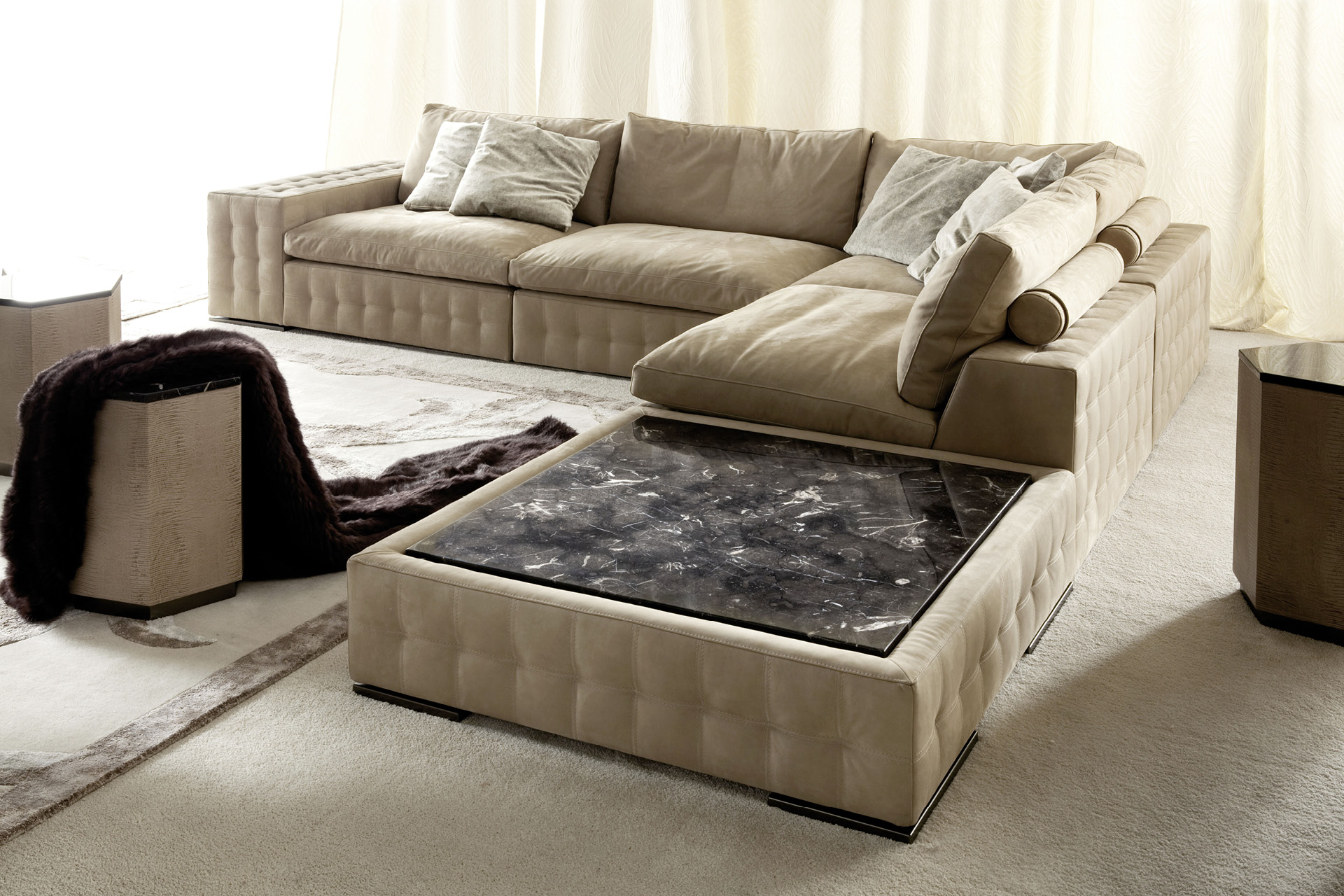 Sayonara sectional sofa available in first grade leather, nubuk leather, lizard printed leather, velvet or suede fabric. Outer frame with square stitchings finish and seat in polyurethane foam wrapped in down feather.