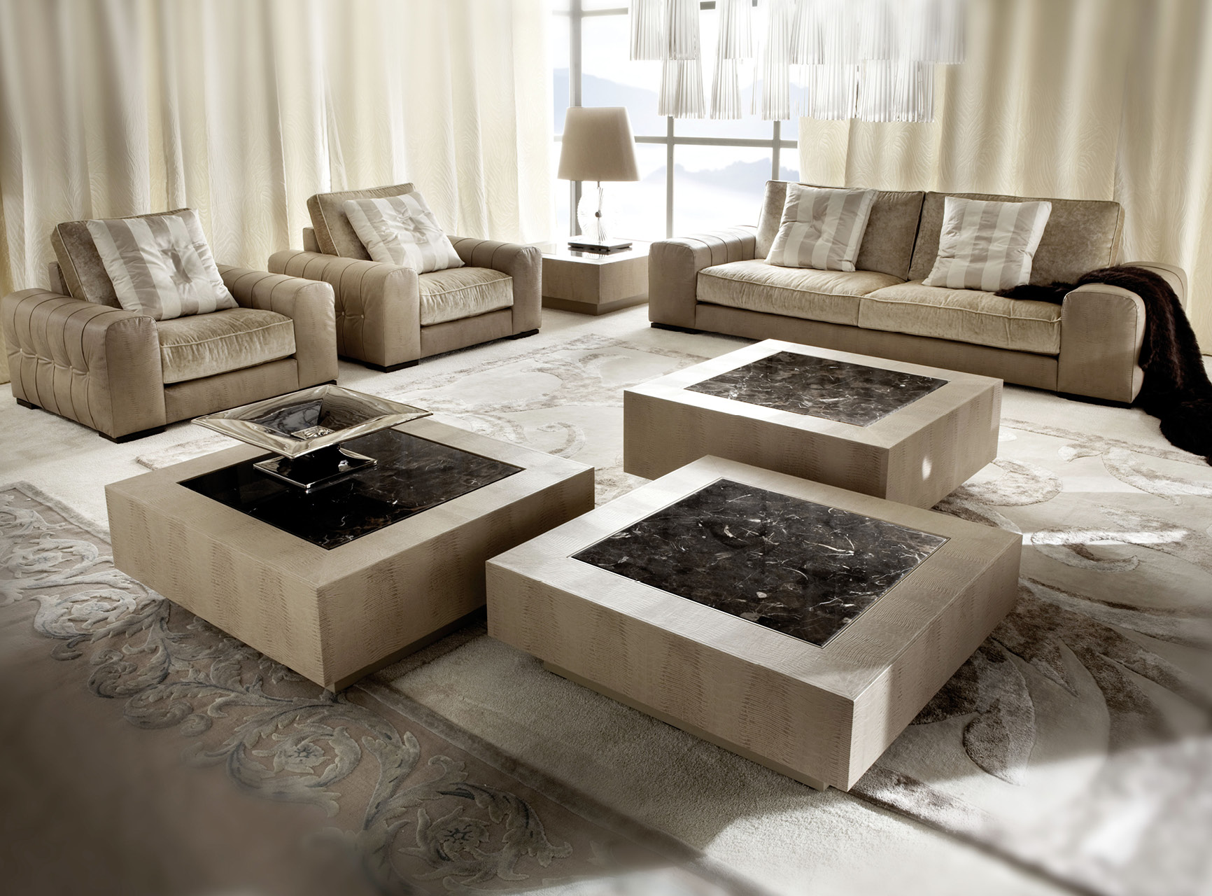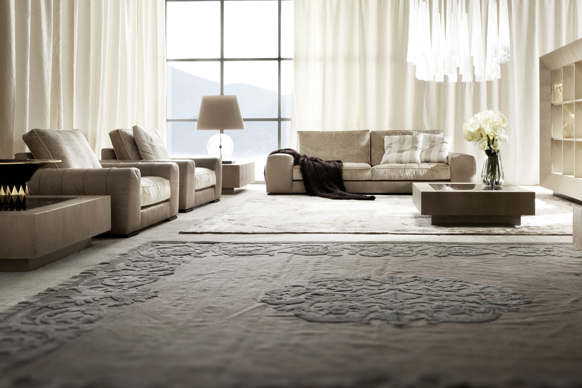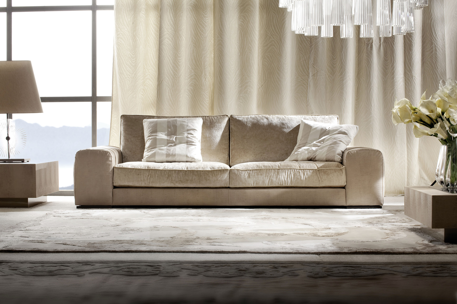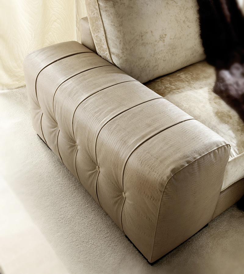 Fixed sofa. Outer frame in buttoned finish, seat in polyurethane foam wrapped in down feather. Bronzed brass feet.