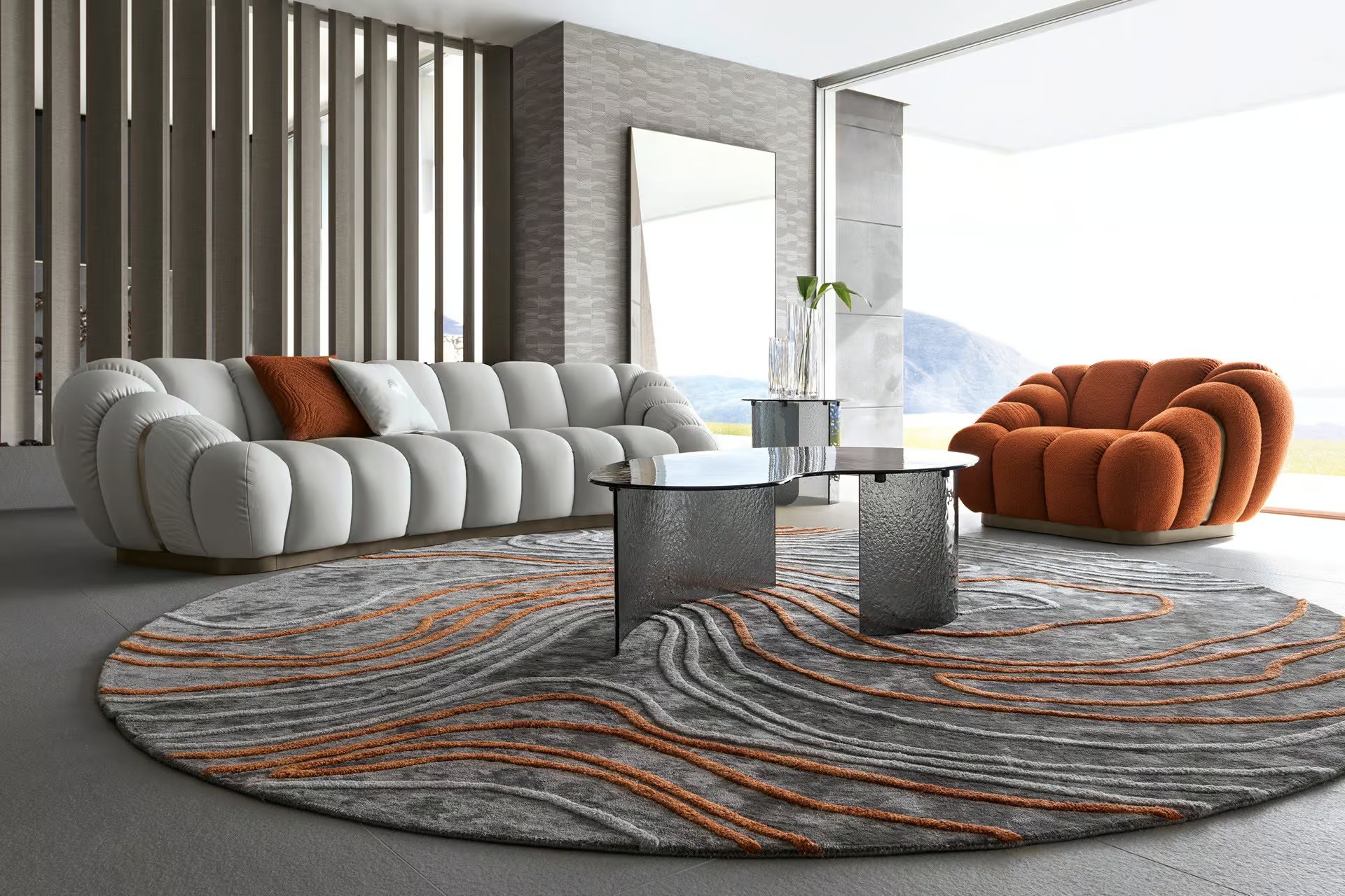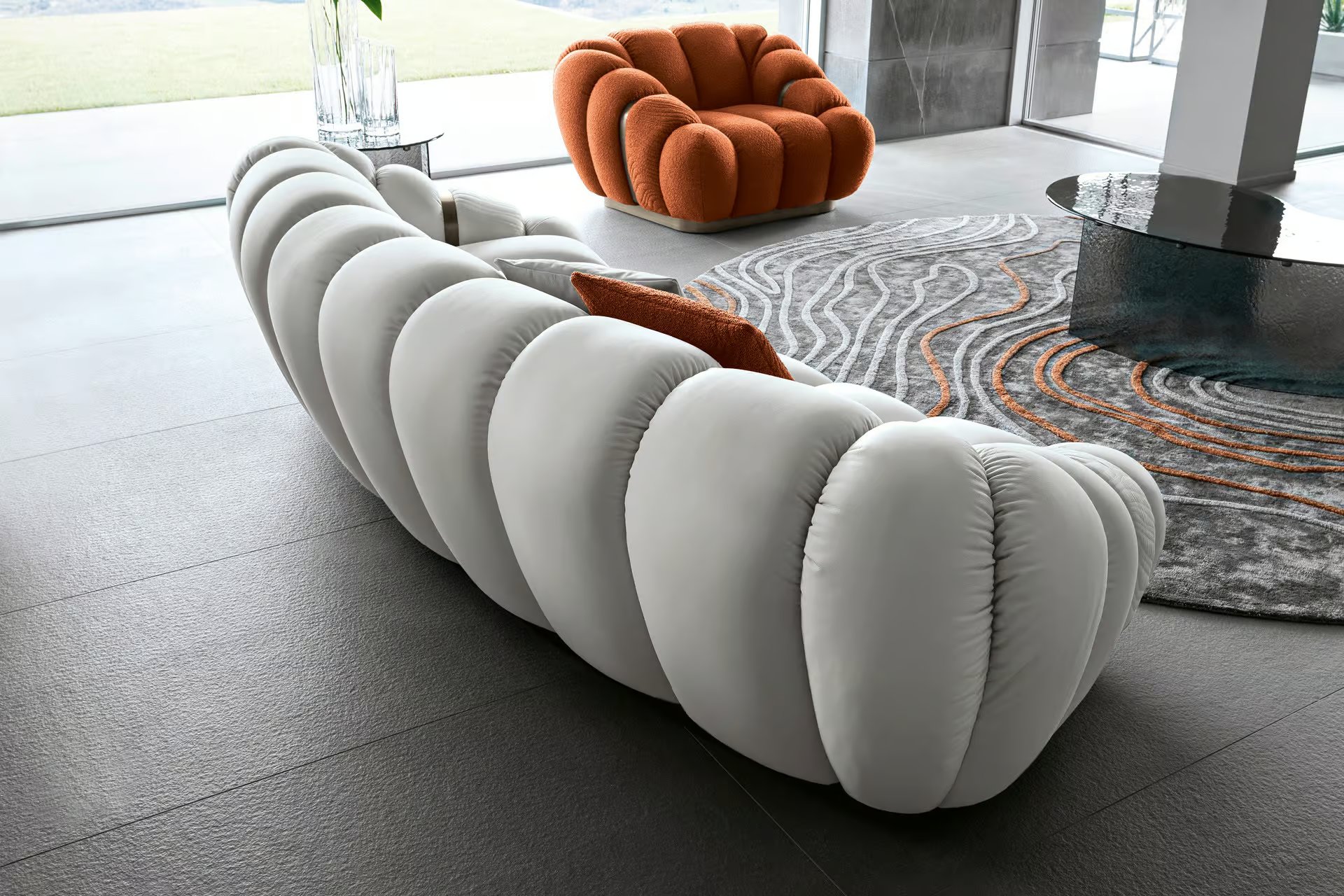 Curved sofa available in first grade leather, nubuk leather, lizard printed leather, velvet or suede fabric. Sofa seats and sides with special stitching in polyurethane foam wrapped in down feather. Quilted armrests. Base and metal trims on the armrests in satined bronzed stainless steel with Giorgio Collection logo. Seat height cm. 42