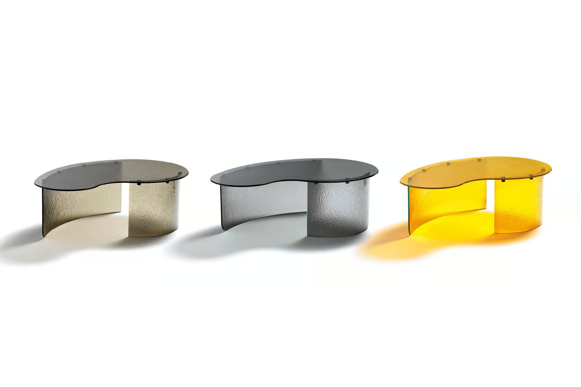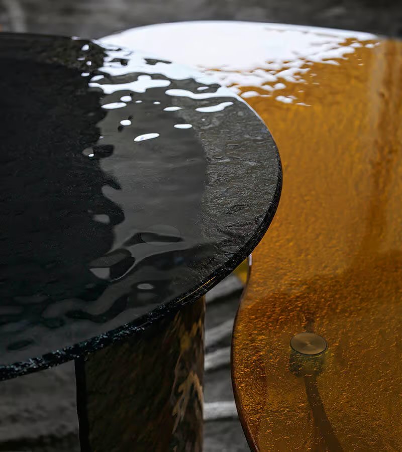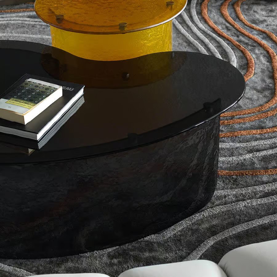 Elliptical cocktail table with top and base available in brown, smoke or amber hand hammered fused glass.