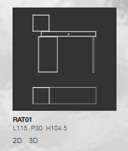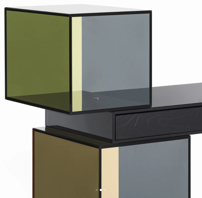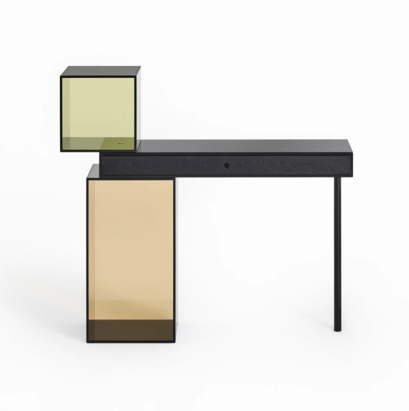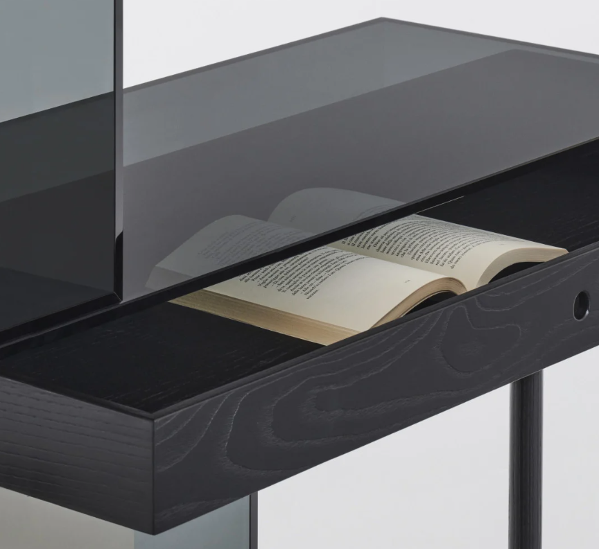 Piccola scrivania composta da scatole in cristallo fumé mm.10 temperato, incollato a 45°, sovrapposte a sbalzo e fissate tra di loro per mezzo di minimali giunti in alluminio anodizzato nero. La scatola del top contiene un cassetto in massello di frassino tinto nero, che appoggia e scivola sul vetro grazie a degli inserti di vellutino. Degli invisibili fermi di sicurezza evitano la caduta del cassetto. Le altre scatole, utilizzabili come vani porta oggetti, sono disponibili realizzate completamente in vetro fumé o con schienale nelle finiture dei “Cristalli Trasparenti Colorati”. Una gamba cilindrica in massello di frassino tinto nero opaco sostiene lateralmente il top, impedendo il ribaltamento dello scrittoio.
