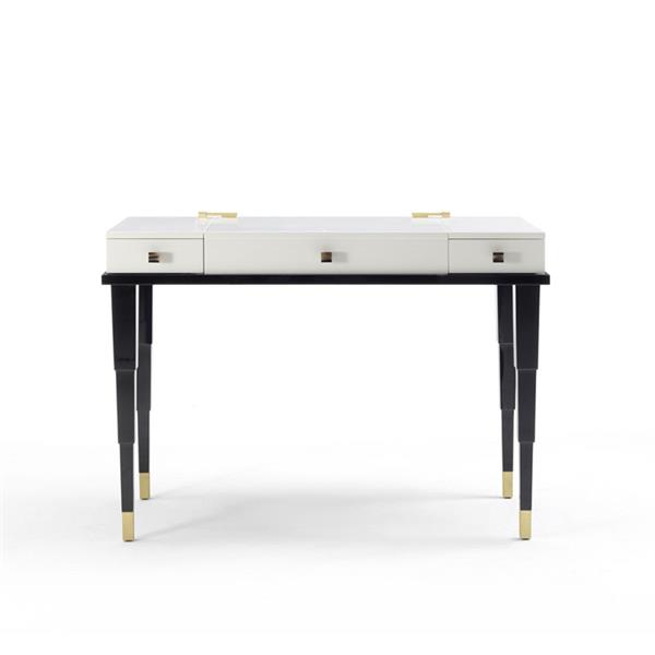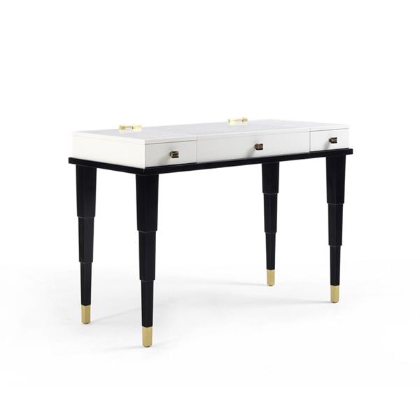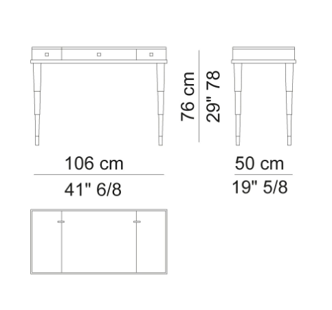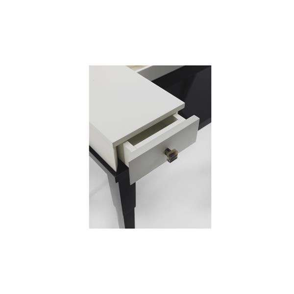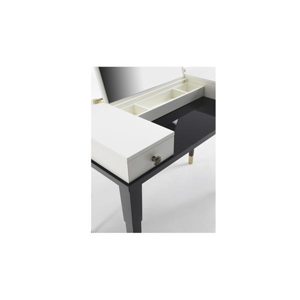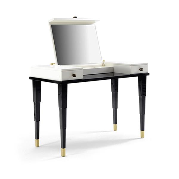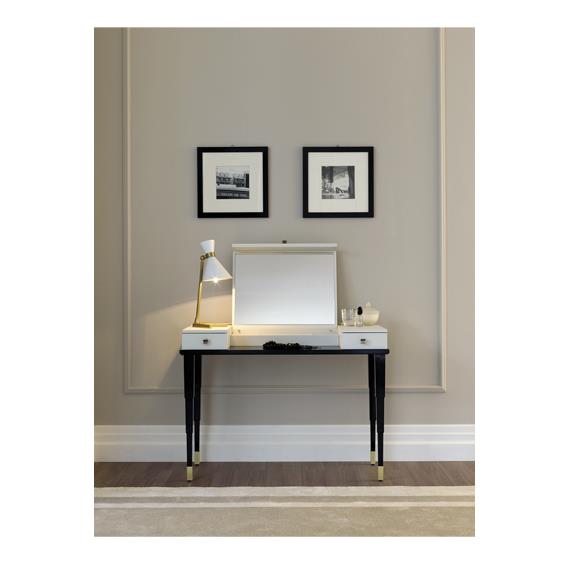 Vanity table with lacquered top, pull-up mirror and satin brass or bronze finish hinges. Lacquered solid wood and wooden panels structure with satin brass or bronze finish legs ferrules. Drawer runners with Blumotion technology. Buffalo’s blond veined horn Dodo handle.