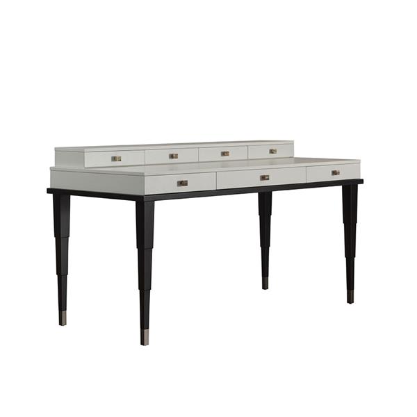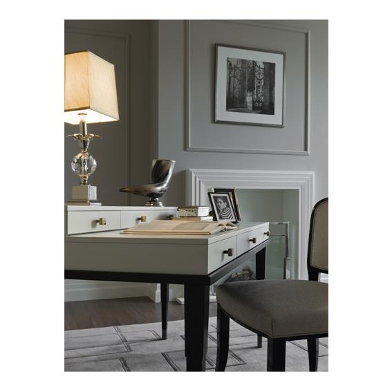 Desk with lacquered top. Lacquered solid wood and wooden panels structure with satin brass or bronze finish legs ferrules. Drawer runners with Blumotion technology and wooden drawer slides for the small drawers. Buffalo’s blond veined horn Dodo handle.