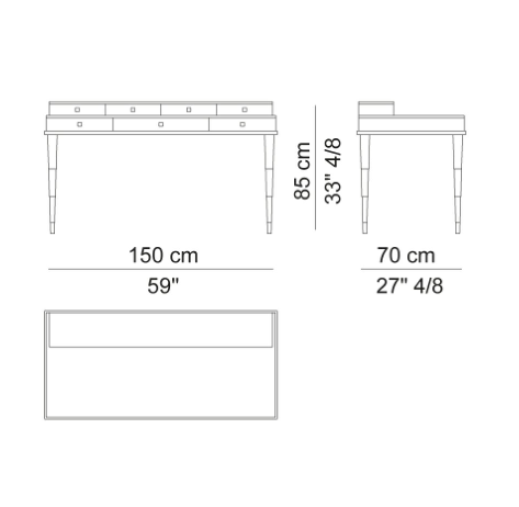 Desk with lacquered top. Lacquered solid wood and wooden panels structure with satin brass or bronze finish legs ferrules. Drawer runners with Blumotion technology and wooden drawer slides for the small drawers. Buffalo’s blond veined horn Dodo handle.