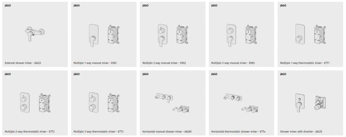 Jago is a series of brass bathroom mixers. It is available in the mixer version, both deck-mounted and wall-mounted, and in the bath and shower kits (manual and thermostatic).