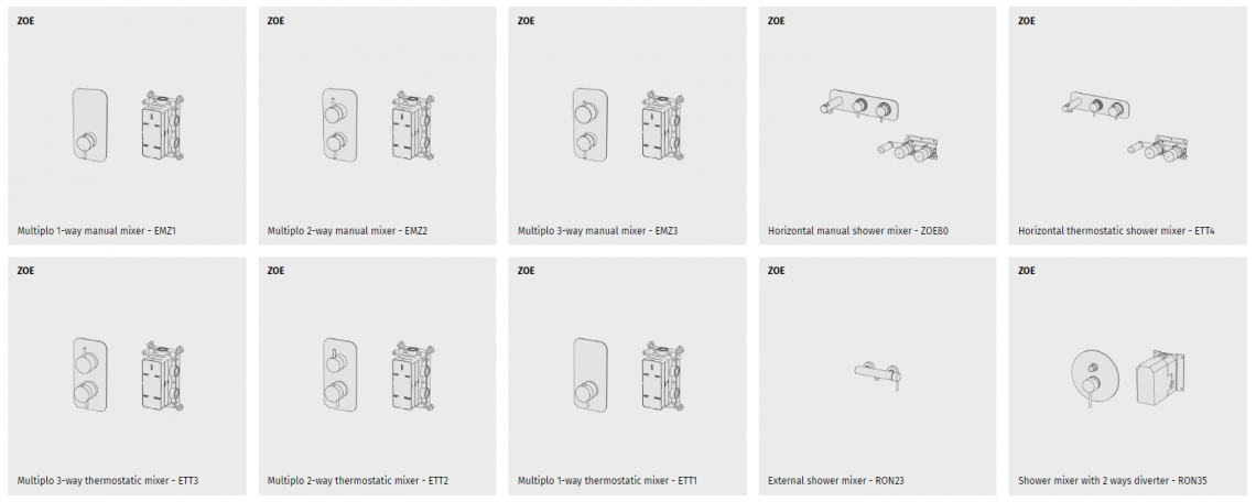 Zoe is a series of brass bathroom faucets suitable for contract and large supplies. It is available in single-hole and wall-mounted versions. Shower fittings are also available in thermostatic version.