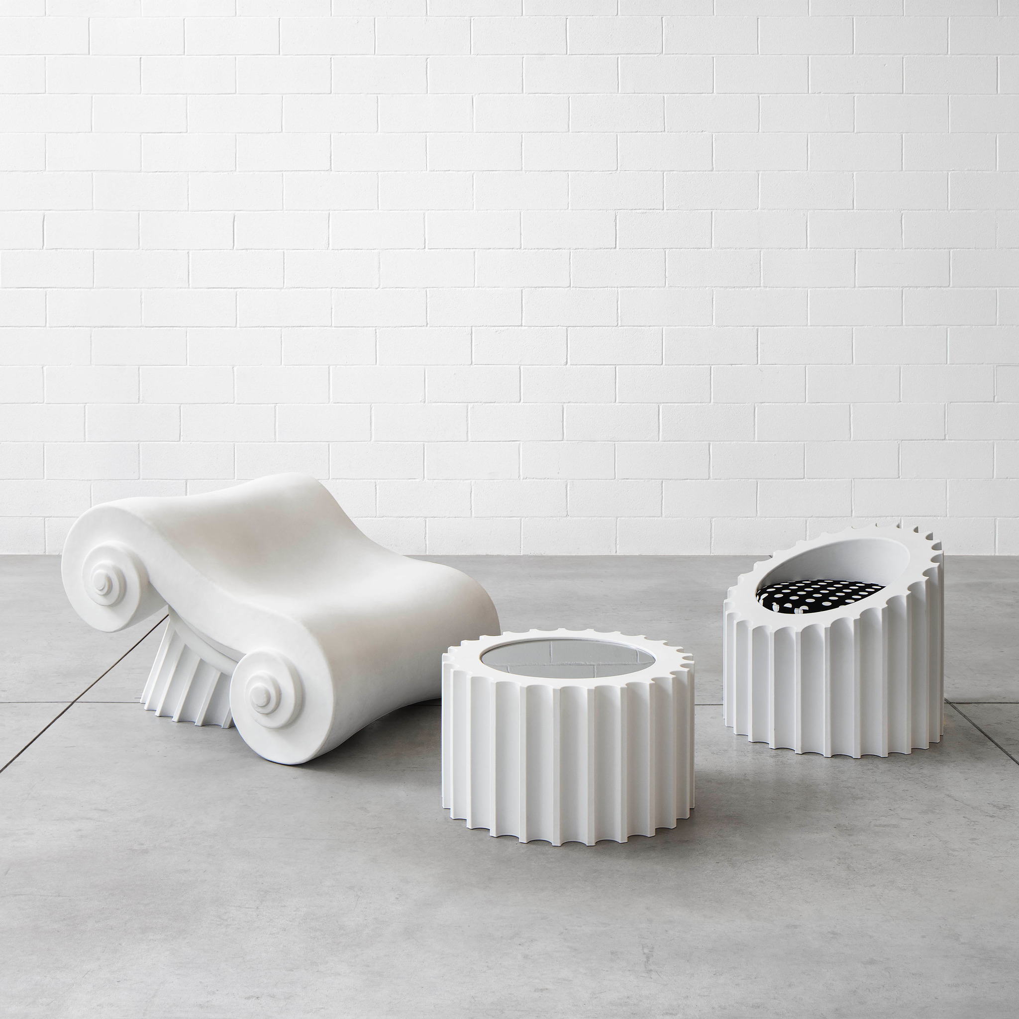 La seduta CAPITELLO, la poltroncina ATTICA e il tavolino ATTICATL, progettati da Studio 65, nascono dalla "decostruzione" di unatradizionale colonna grecd, dando vita a una serie unica cheemula le varie parti della stessa. Ciascun pezzo vieneartigianalmente realizzato in morbido poliuretano e finito conGuflac? Utra, consentendo un utilizzo sia per interni sia peresterni, conferendo l'aspetto del marmo dal quale trae ispirazione.La tensione tra aspettative e realt?? crea un senso di meraviglia,poiché la morbidezza degli arredi contrasta con la durezza dellapietra.Questa iconica serie pop è stata esposta in prestigiosimusei, tra cui il Louvre e il Metropolitan Museum di New York, erappresenta un interessante esempio di rinascita dalle rovine.