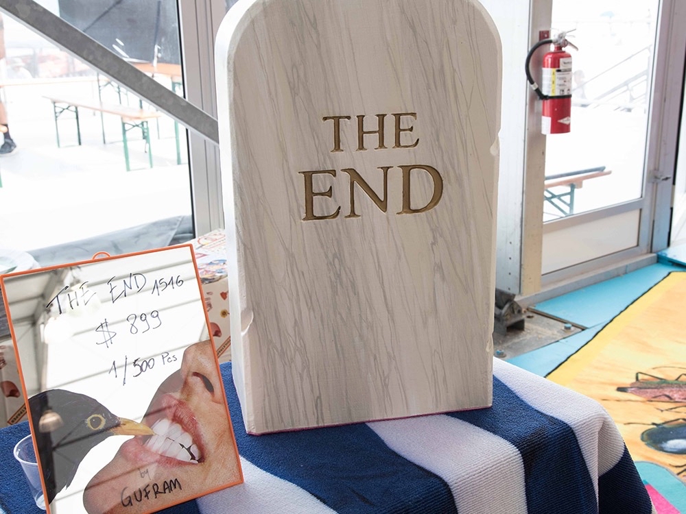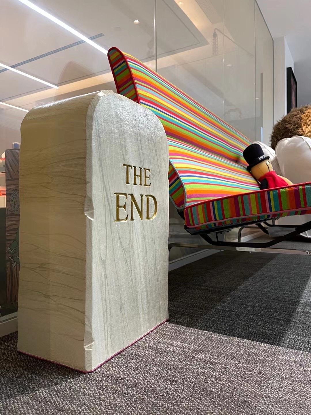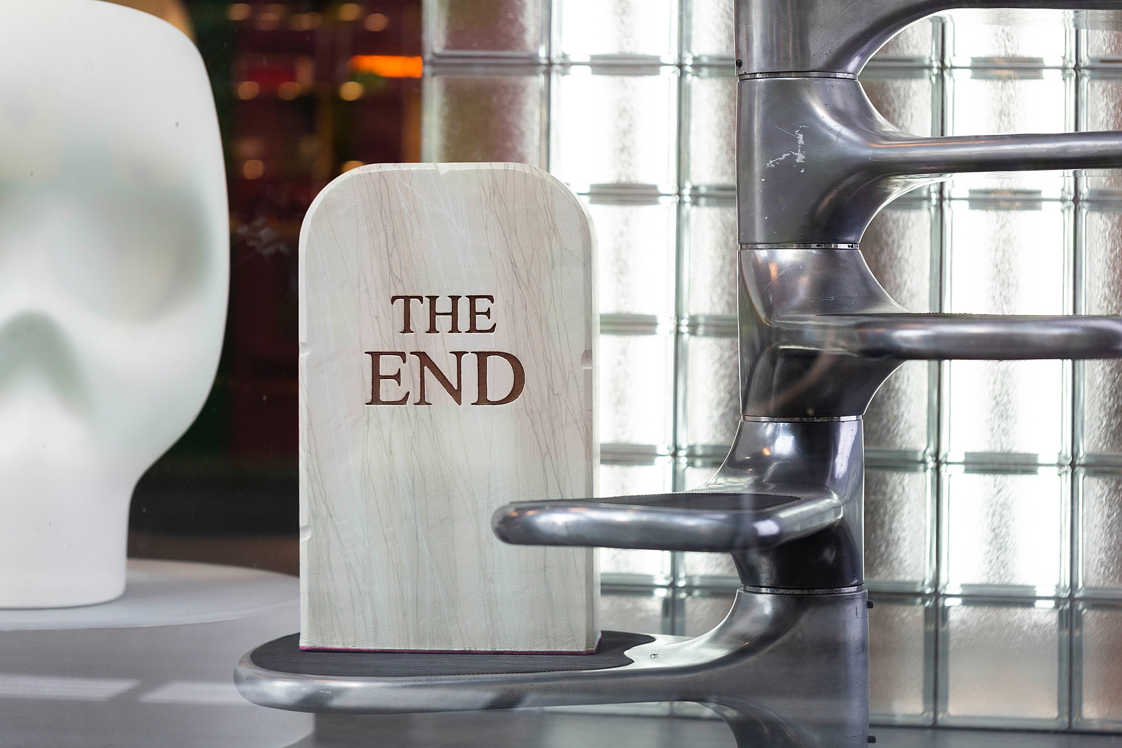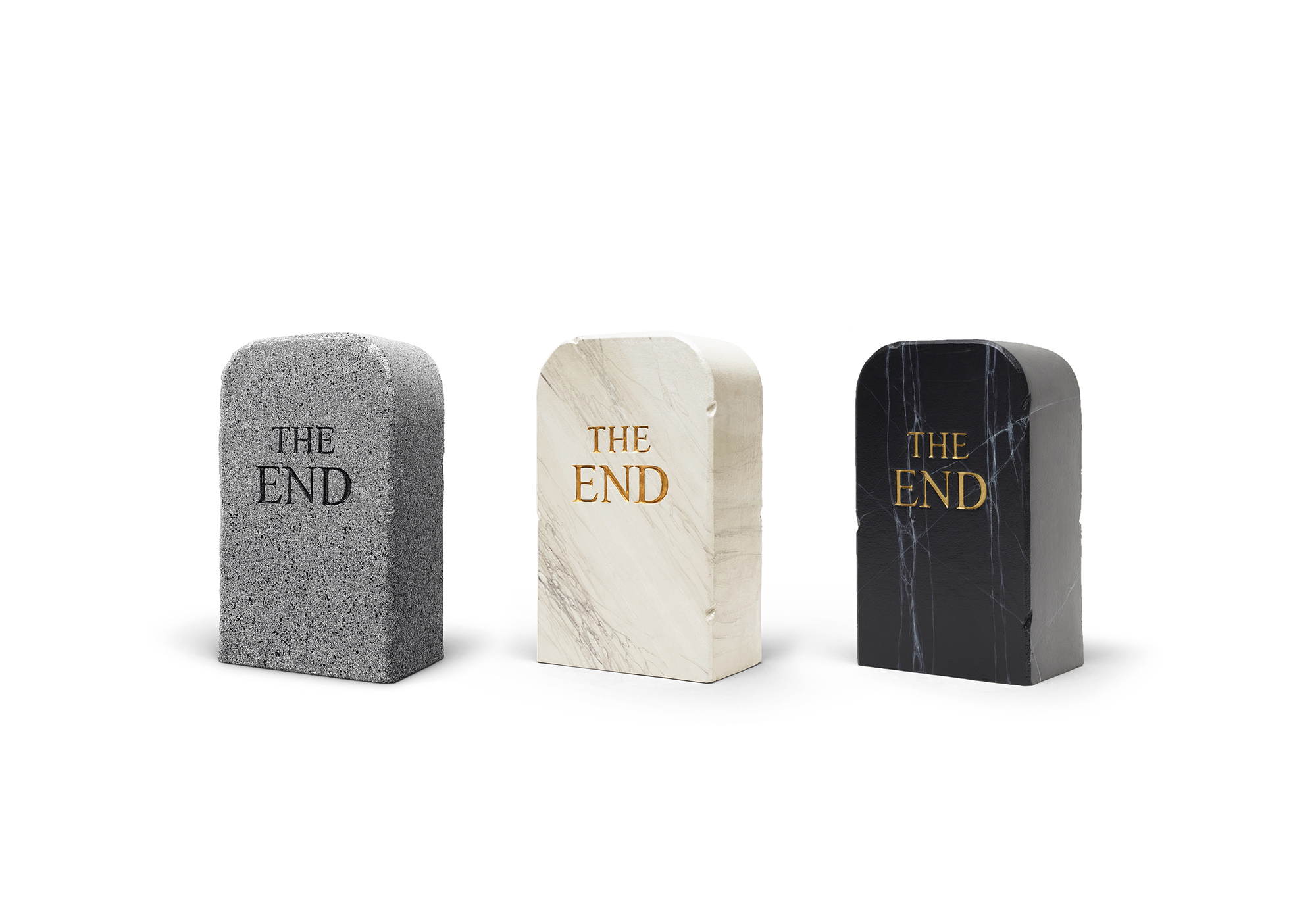 In una paradossale celebrazione del glorioso passato di Gufram,TO|LETPAPER presenta "THE éND", una seduta simile a una lapideche proclama la fine di Gufram in finto marmo. lronia della sorte, ilsuo aspetto funereo è annullato dalla morbidezza e dallaleggerezza della sua composizione in poliuretano. E, nonostantedichiari la fine di Gufram, ci si può sedere su questa lapide come suuno sgabello, incarnando lo spirito di anti-design che Gufram hasempre sostenuto.