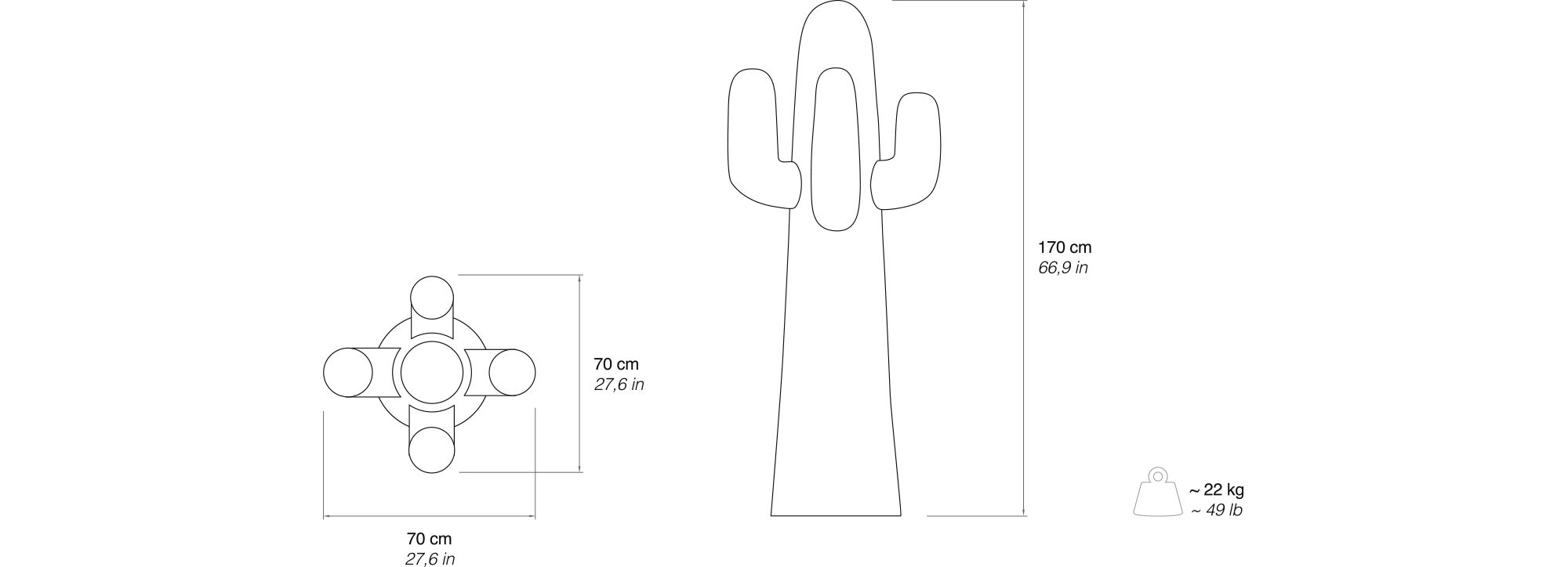 Finally the miniature Cactus?, one of the radical design symbols par excellence. Gufram offers its fans a version identical to the original designed by Drocco and Mello in 1972. The mini mold is perfectly identical to the full-scale design and shows 2165 dimpled areas that decorate the stem and the arms of this otherworldly coat rack. The color was obtained by carefully studying the original green color to reproduce it, giving design enthusiasts a chance to own, albeit in a reduced version, a limited-edition design piece that is now sold out.