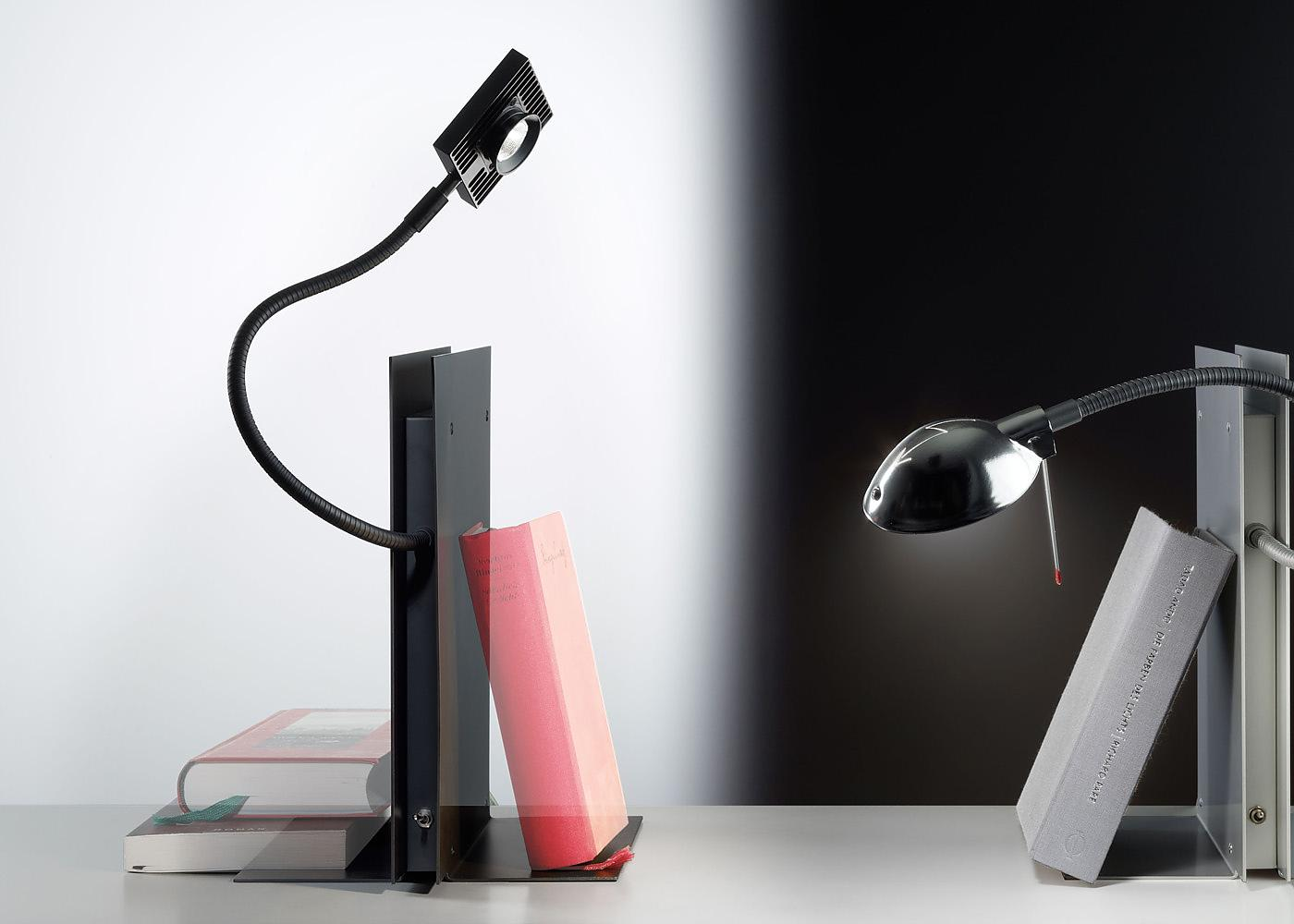 The body of the lamp serves as bookend. The flexible metal arm allows variable adjustment of the lamp head. Anodised aluminium in black or silver, metal.