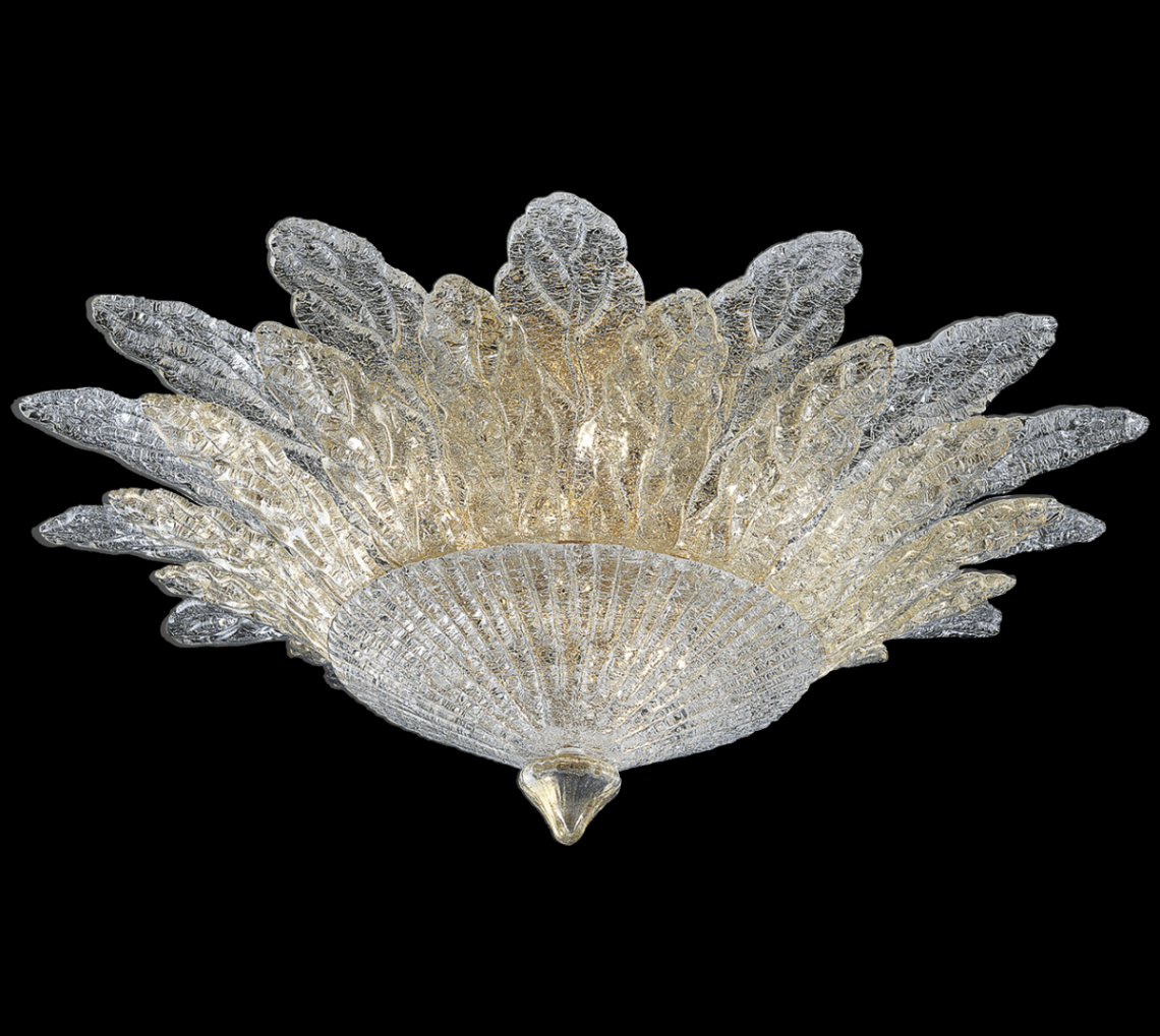 Ceiling lamp with transparent and gold graniglia glass leaves, metal with gold finish. Available in different dimensions and colours. Opera Classic Collection.