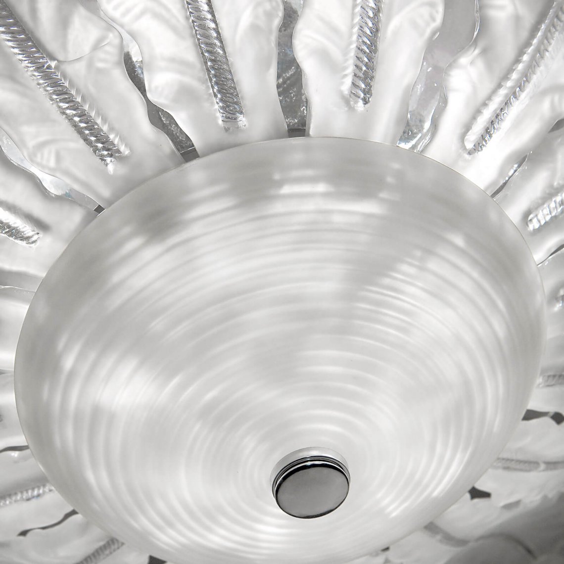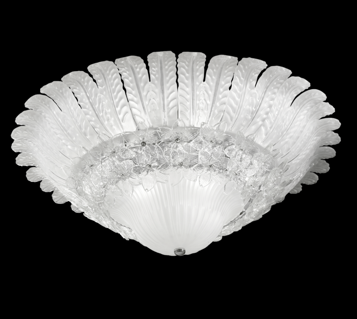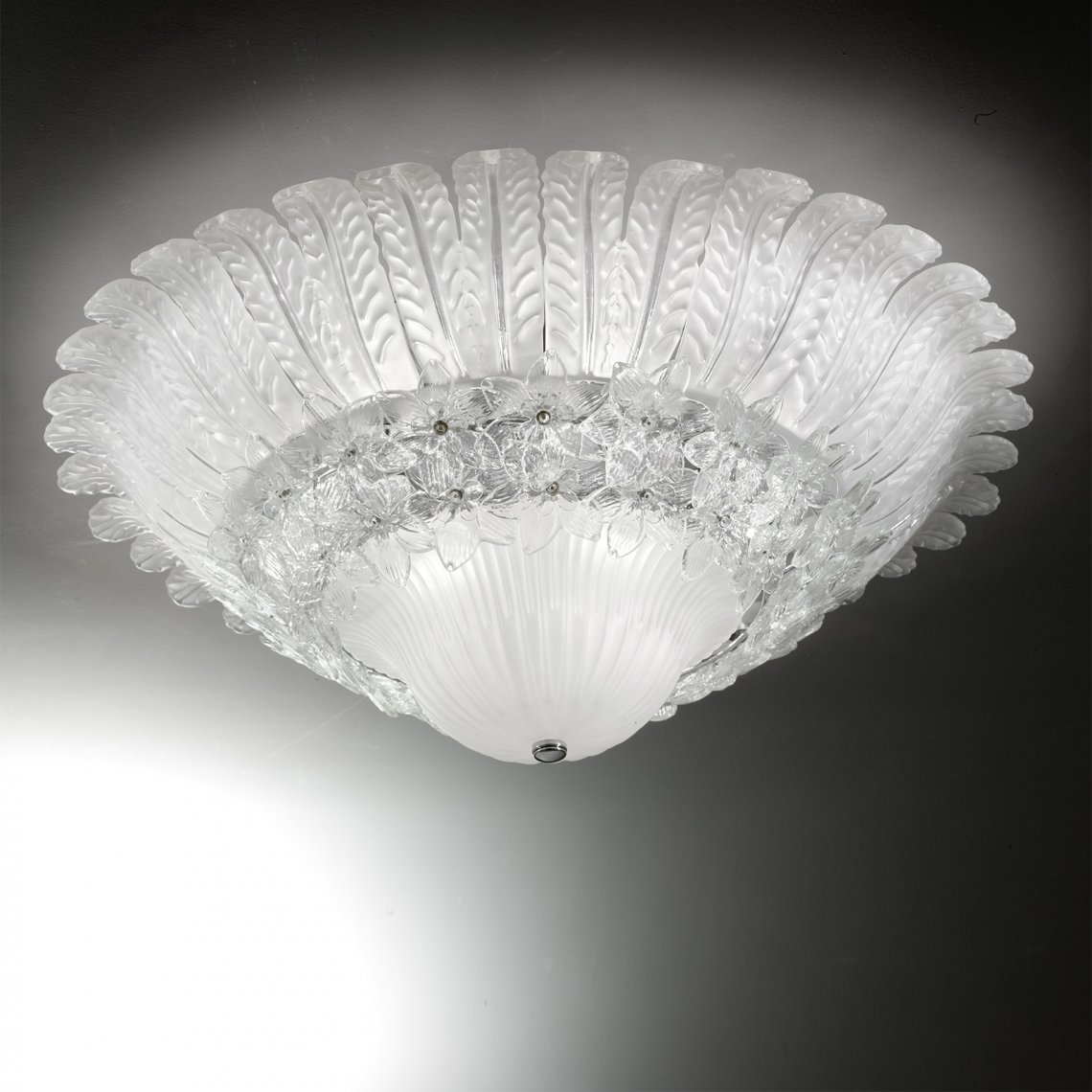 Ceiling lamp with satin glass leaves and decorative clear glass flowers. Metal with nickel finish. Available in different dimensions and colours. Opera Classic Collection.
