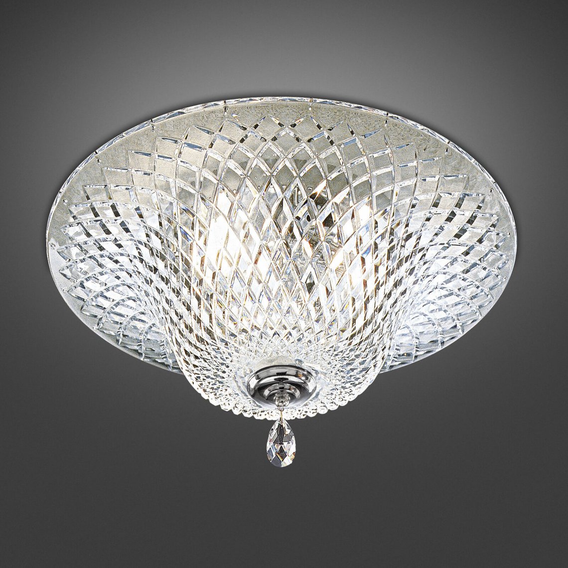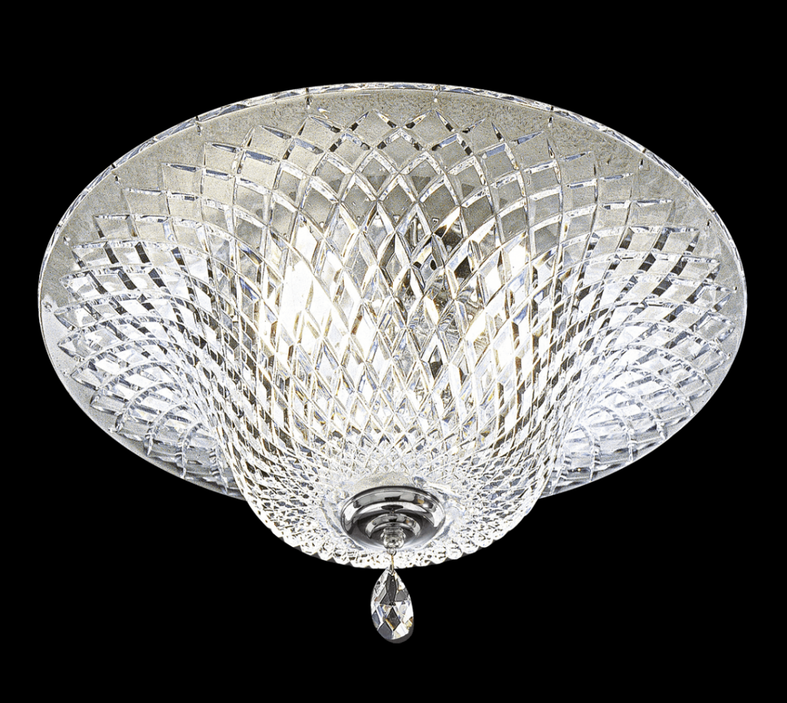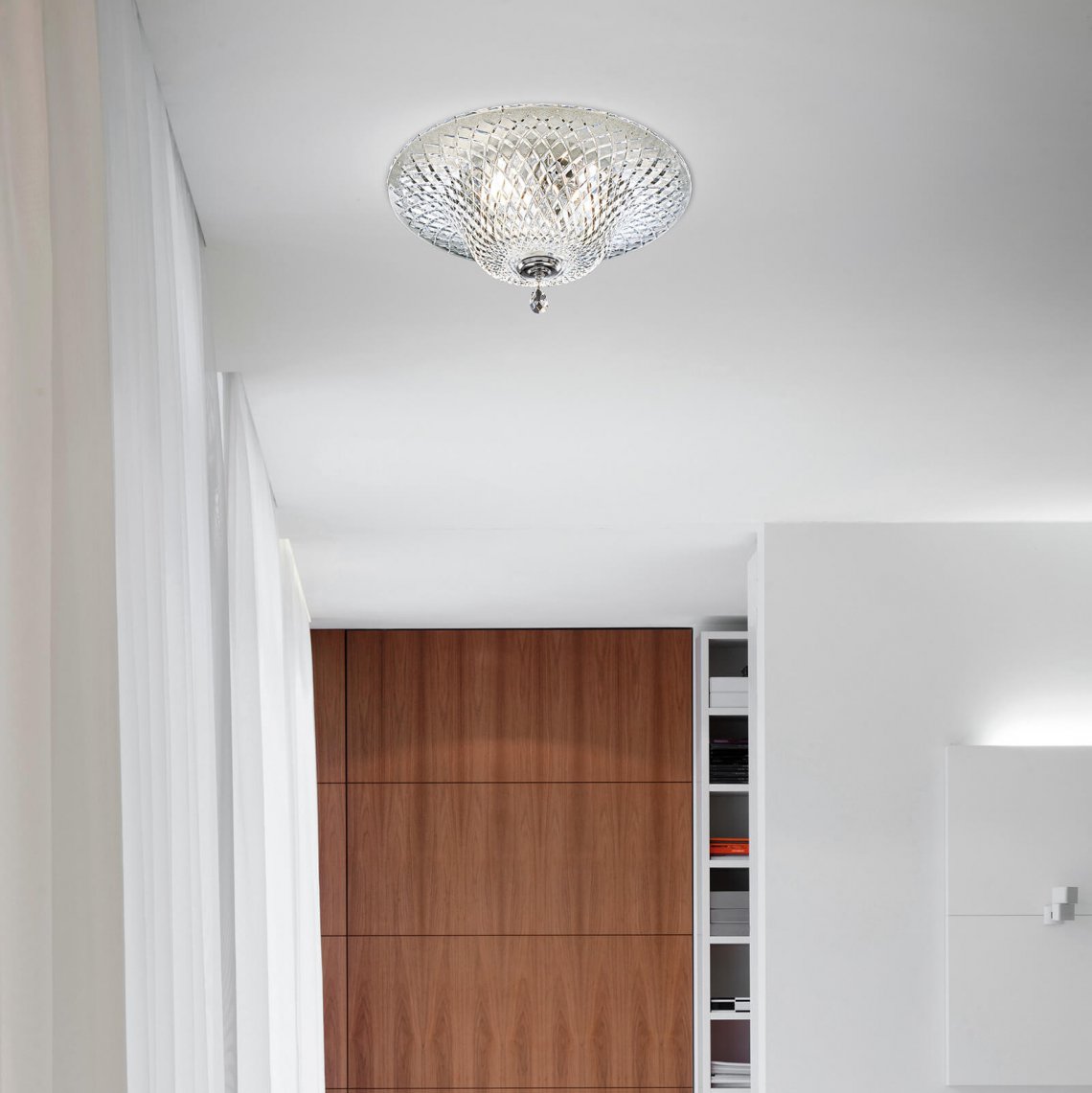 Ceiling lamp with chrome metal finish and transparent carved crystal diffuser, Swarovski Elements pendant. Available in different colours. Opera Classic Collection.
