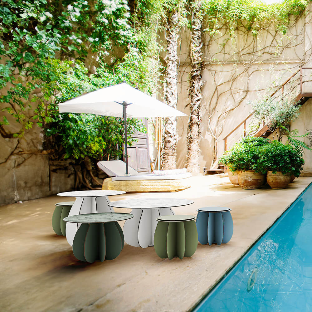 Our Cholla small outdoor stool is available in two heights: 35 centimetres to match the coffee tables in the Gardenia collection, and 45 centimetres to suit a dining table or desk. With its rounded shape, this small stool is designed for outdoor spaces and is ideal for creating a complete garden lounge with our Parodia Magnifica coffee table design