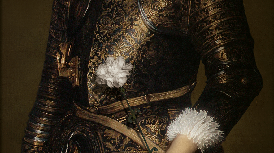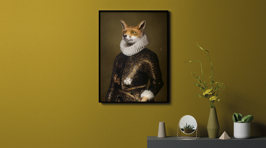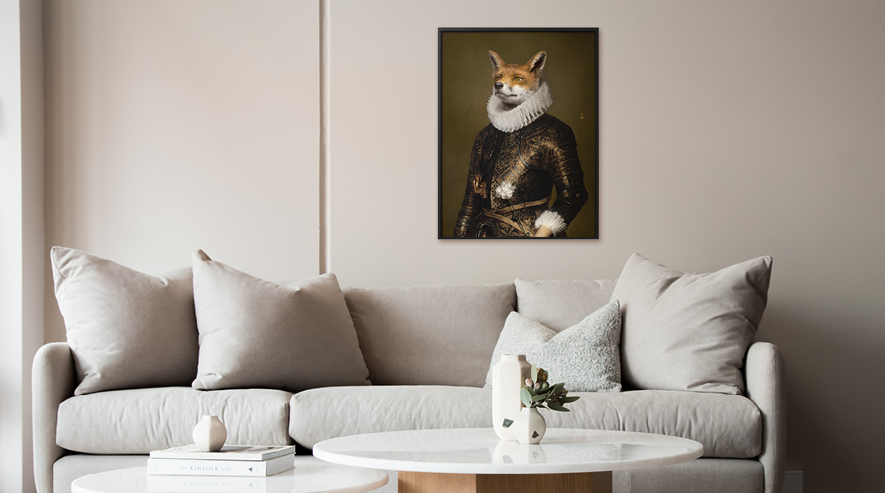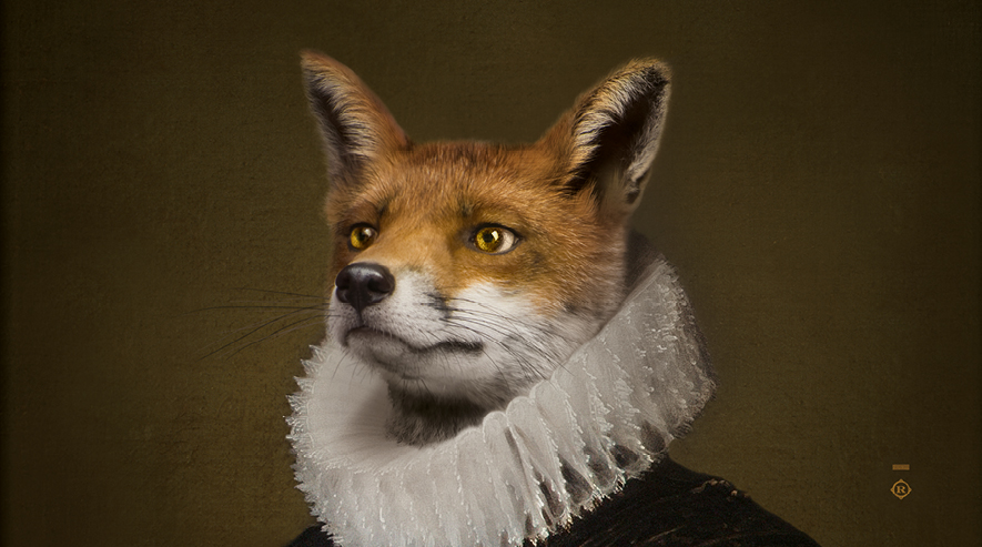 An emblematic animal in the works of Jean de La Fontaine, the cunning Fox with the air of a romantic hero dons his conqueror's armour without losing the white carnation of passion nestling in his hand.