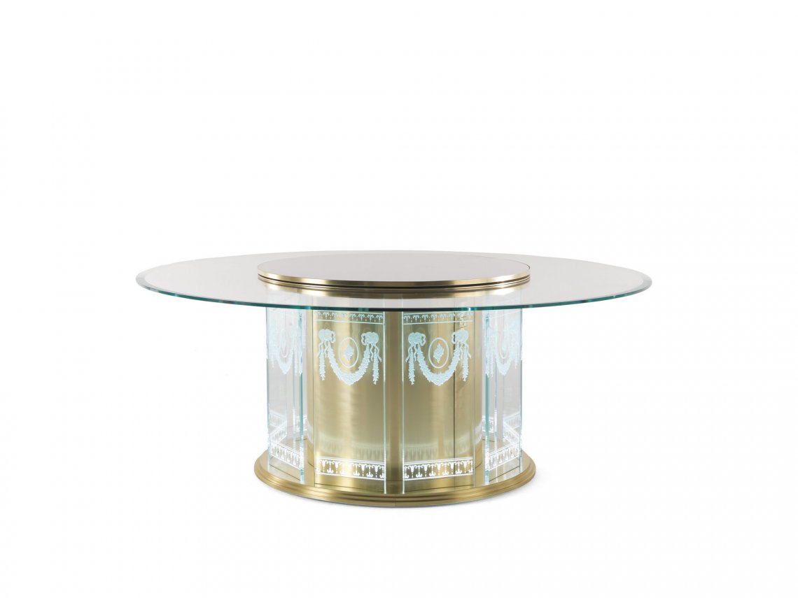 DINING TABLE WITH STRUCTURE IN METAL WITH GOLD FINISHING. ENGRAVED GLASSES WITH ORIENTAL CLASSICAL DECORATIONS. TOP IN BEVELLED GLASS, WITH OPTIONAL ELECTRICAL ROTATING LAZY SUSAN IN CLOUDY ONYX. LIGHTING SYSTEM.