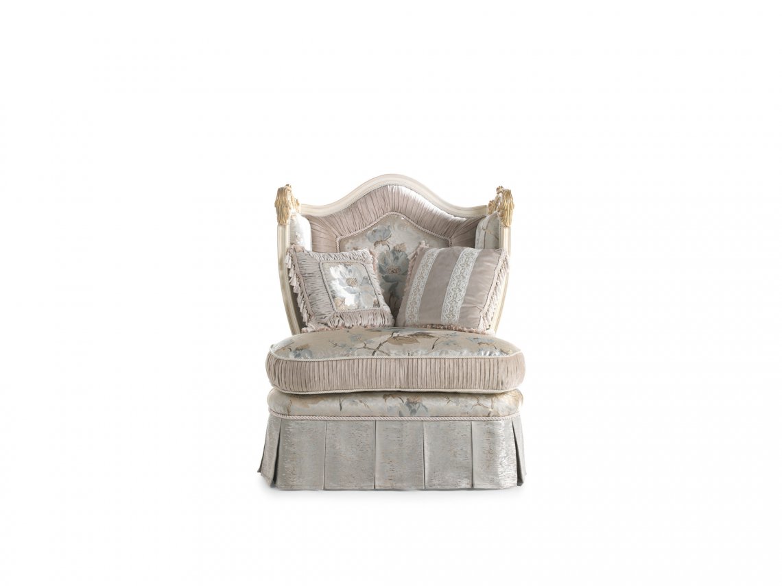 ARMCHAIR WITH STRUCTURE IN BEECHWOOD. PADDING IN FOAM. UPHOLSTERY IN FABRIC WITH DECORATIVE FRINGE.