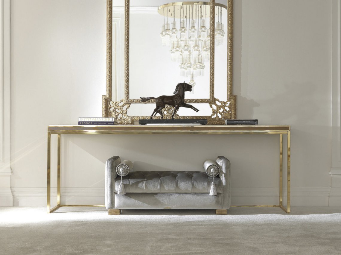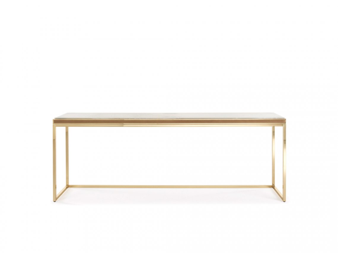 CONSOLE WITH STRUCTURE IN BRASS WITH GLOSSY FINISHING. ENGRAVED FRAME. TOP IN WHITE NAMIBIA RHINO MARBLE.