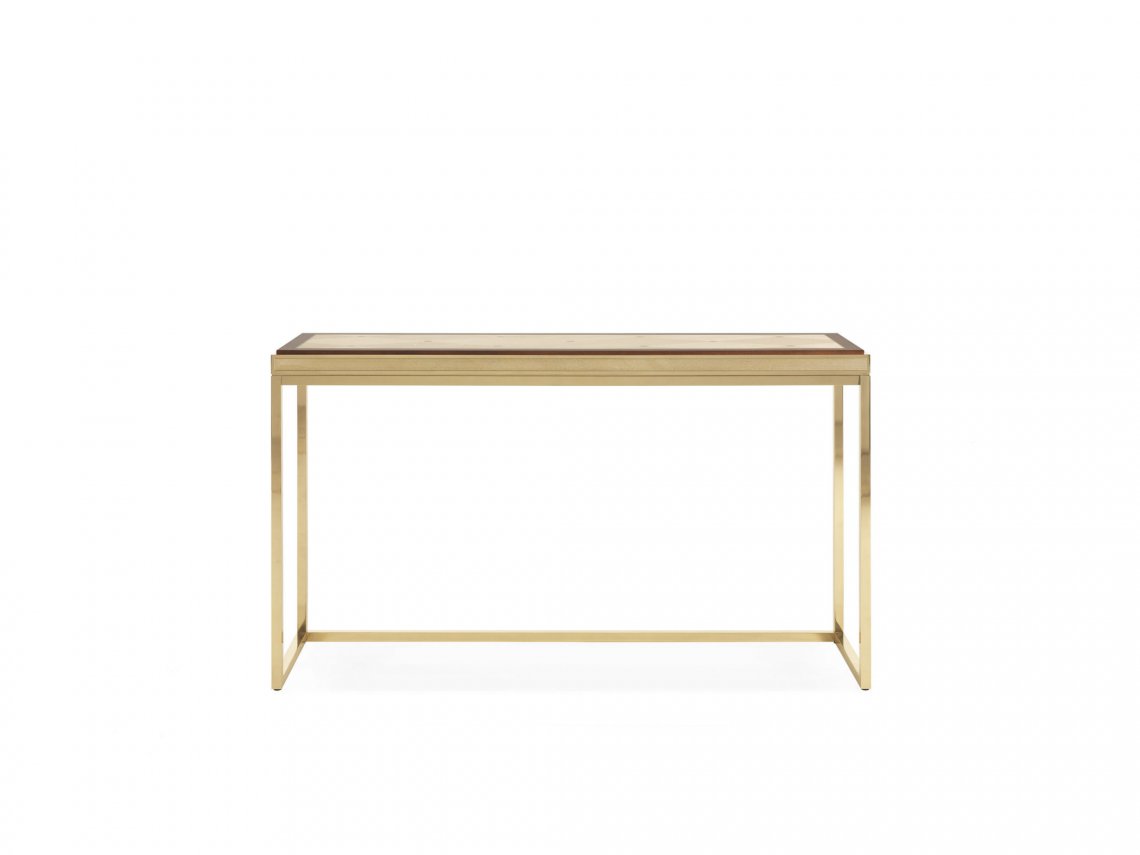 CONSOLE WITH STRUCTURE IN GLOSSY BRASS WITH ENGRAVED FRAME. TOP IN WALNUT WITH INSERT IN NATURAL MAPLE AND BRASS INLAYS.