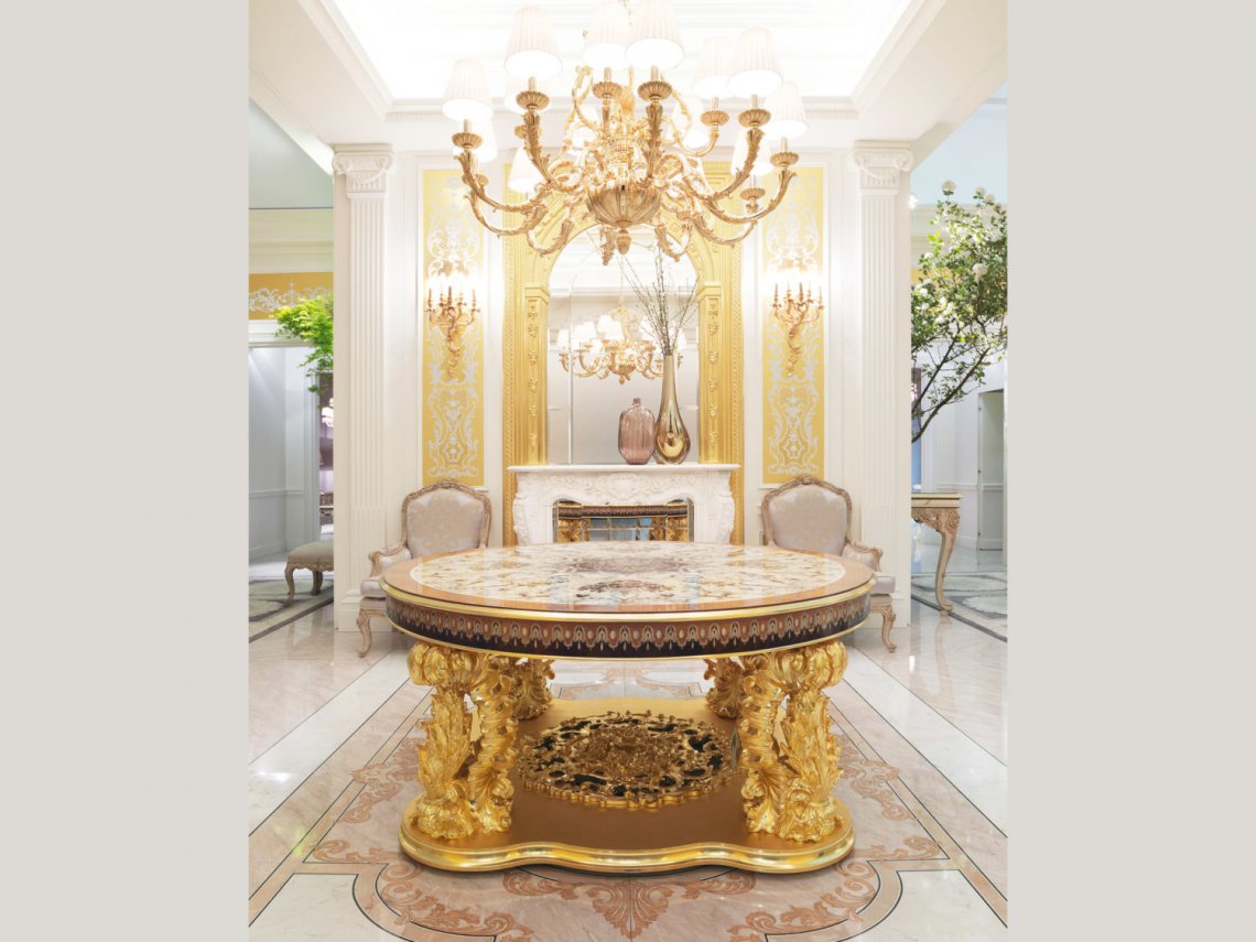 ENTRANCE TABLE WITH BASE IN HAND-CARVED WOOD WITH GLOSSY AND MATTE GOLD FINISHING. TOP IN WOOD WITH MOTHER OF PEARL AND WALNUT INLAYS AND WITH HAND-MADE DECORATIONS.