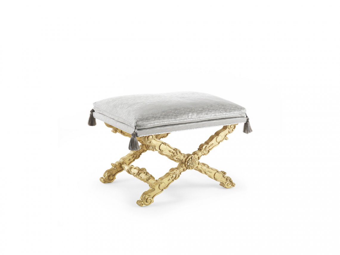 BENCH WITH STRUCTURE IN HAND-CARVED BEECHWOOD WITH PATINATED ANTIQUE GOLD FINISHING. SEAT IN FOAM. UPHOLSTERY IN FABRIC.