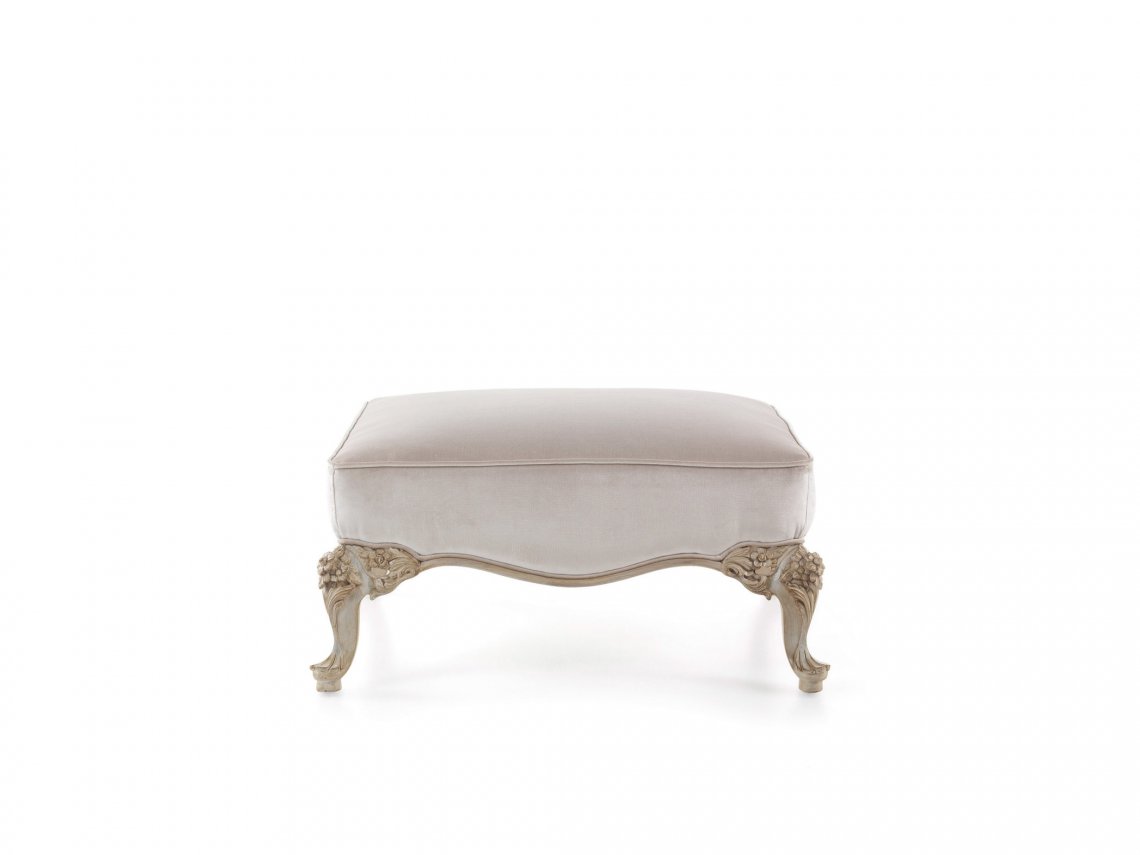 POUF WITH STRUCTURE IN HAND-CARVED BEECHWOOD WITH PATINATED WHITE FINISHING. PADDING IN FOAM. UPHOLSTERY IN FABRIC.