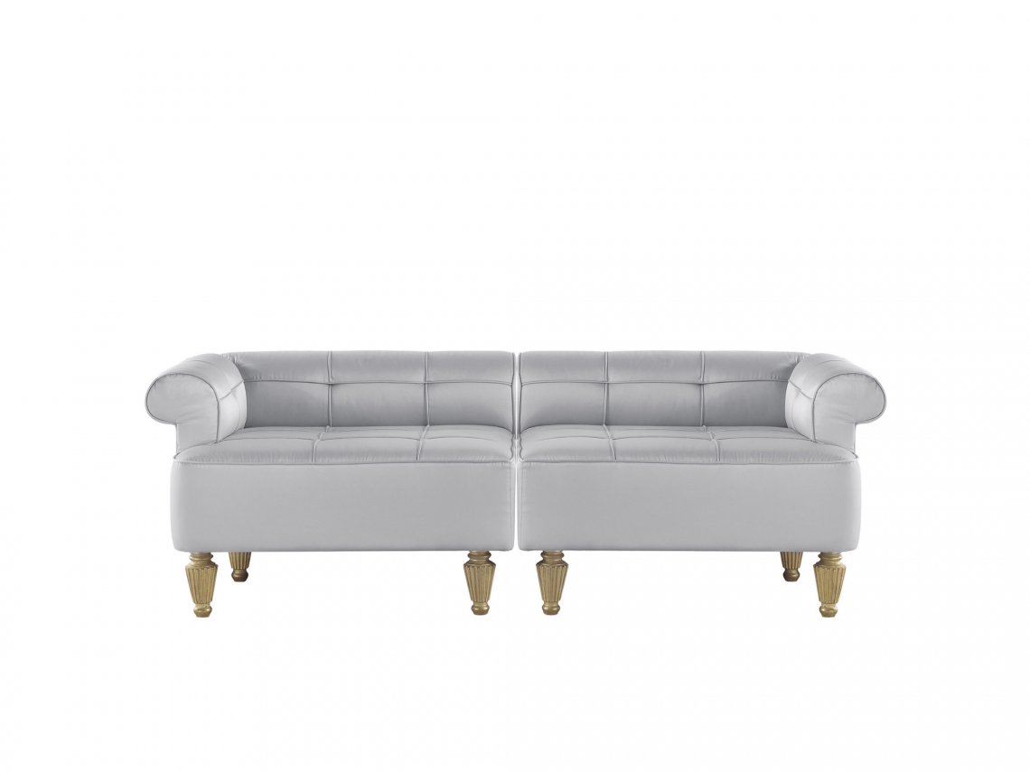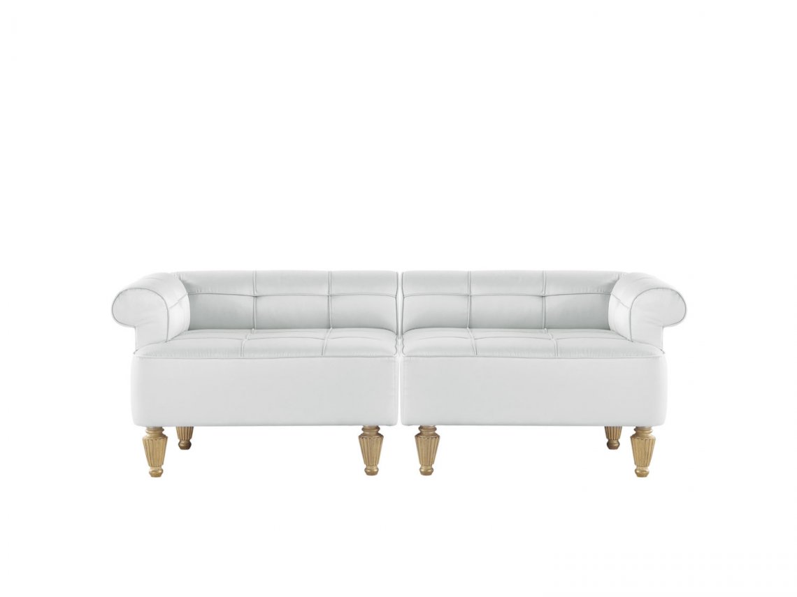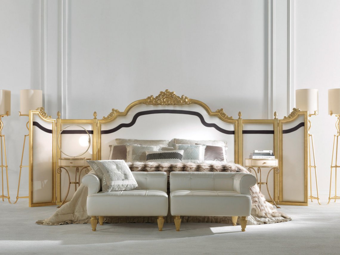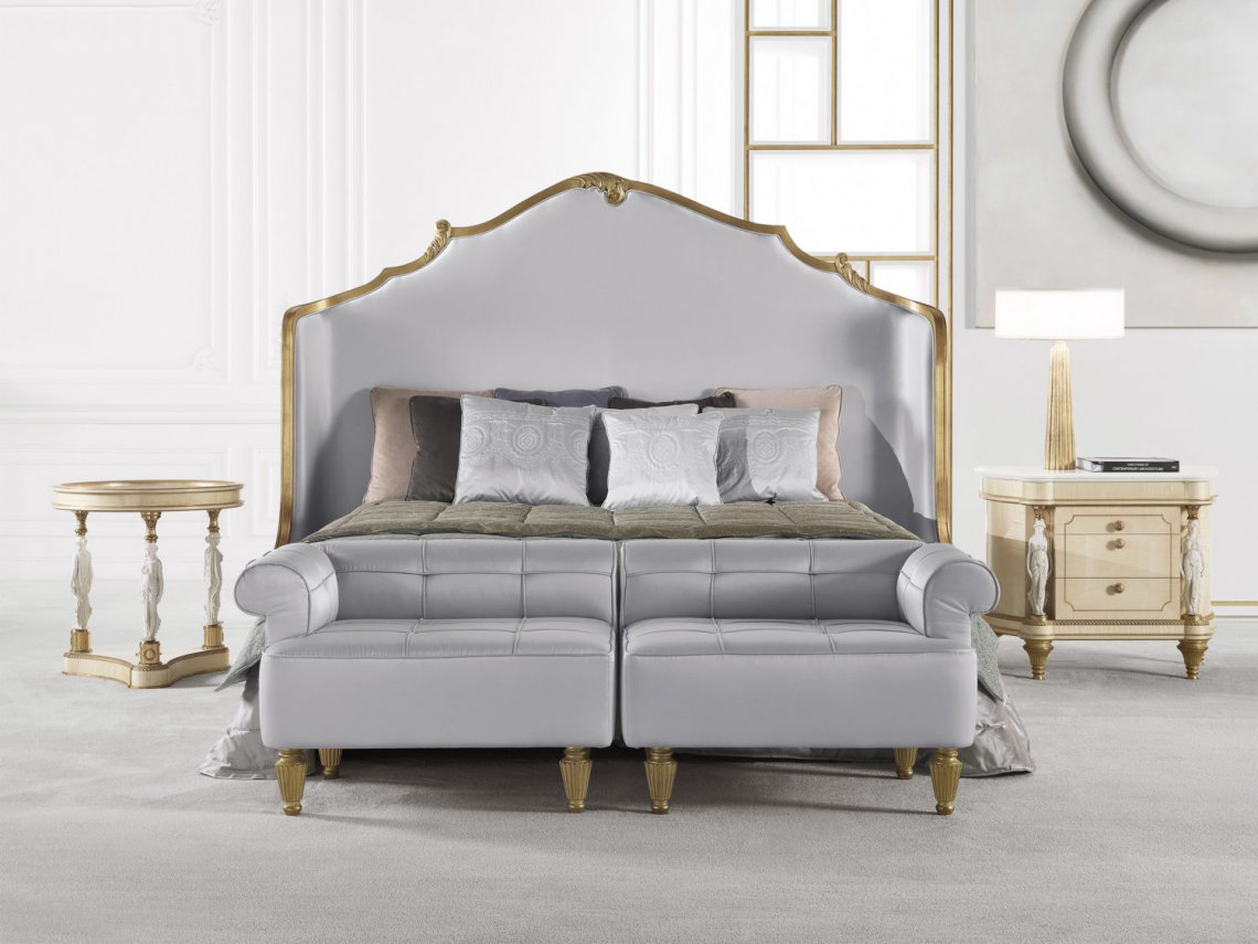 Bench with structure in beechwood. Padding in foam. Upholstery in fabric. Feet in wood with patinated antique gold finishing.