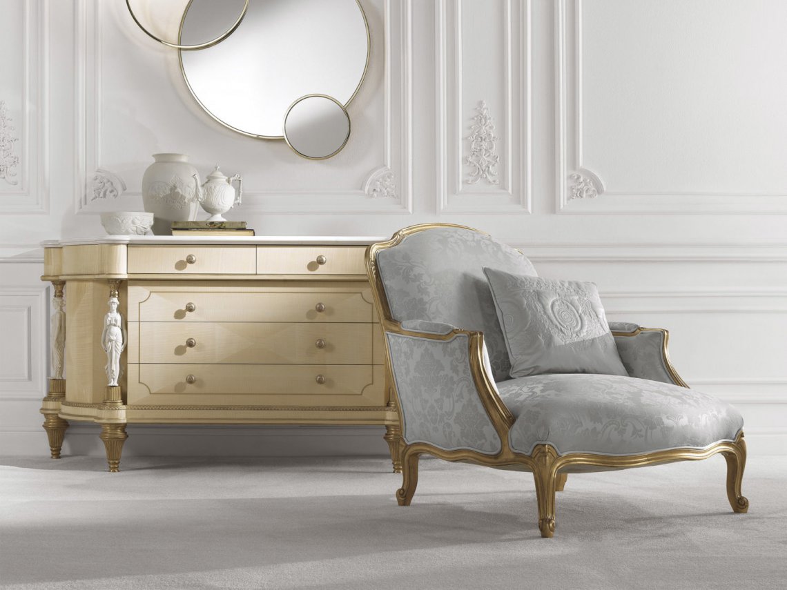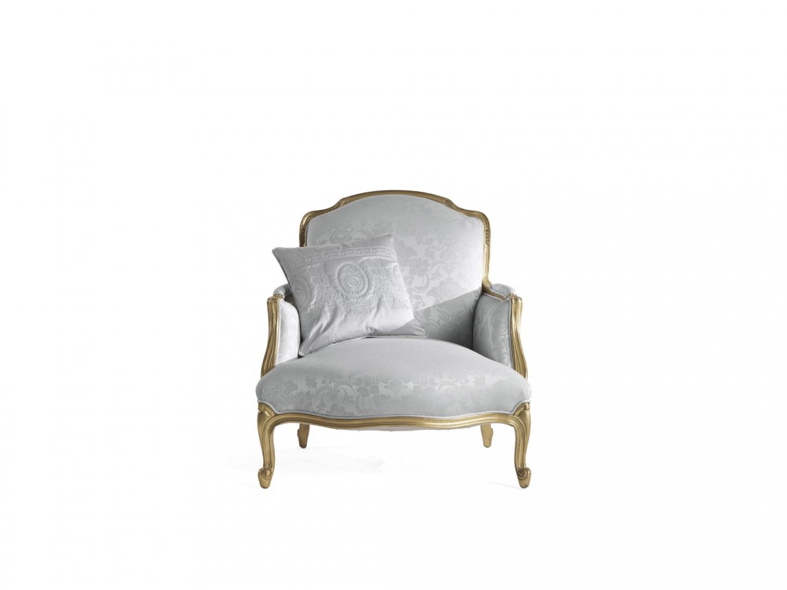 ARMCHAIR WITH STRUCTURE IN HAND-CARVED SOLID BEECHWOOD WITH PATINATED ANTIQUE GOLD FINISHING. PADDING IN FOAM. UPHOLSTERY IN FABRIC.