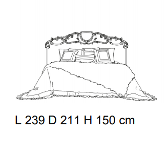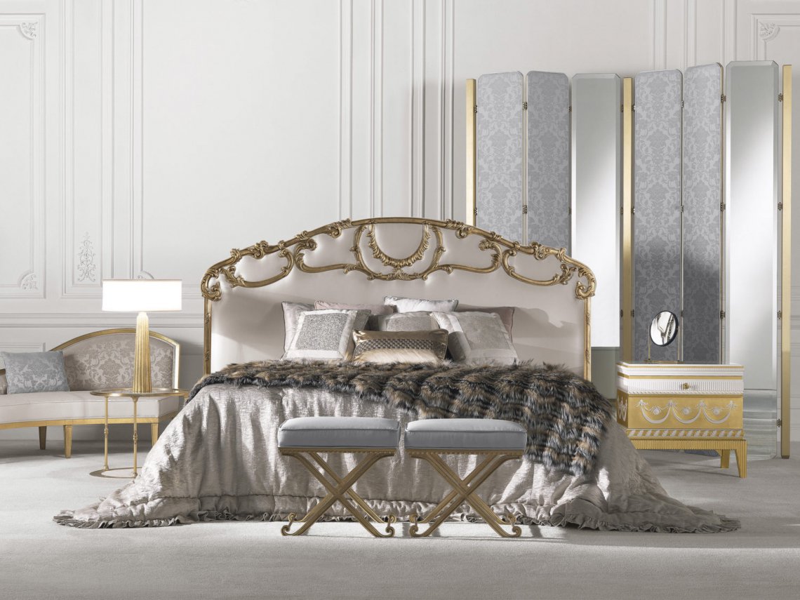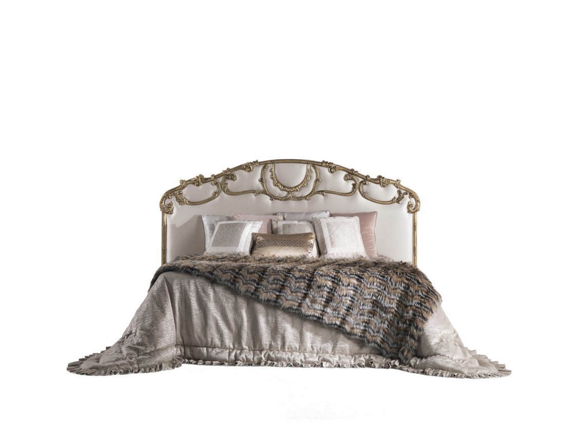 BED WITH STRUCTURE IN HAND-CARVED BEECHWOOD WITH PATINATED ANTIQUE GOLD FINISHING. HEADBOARD AND SOMMIER COVERED IN SILK SATIN FABRIC.