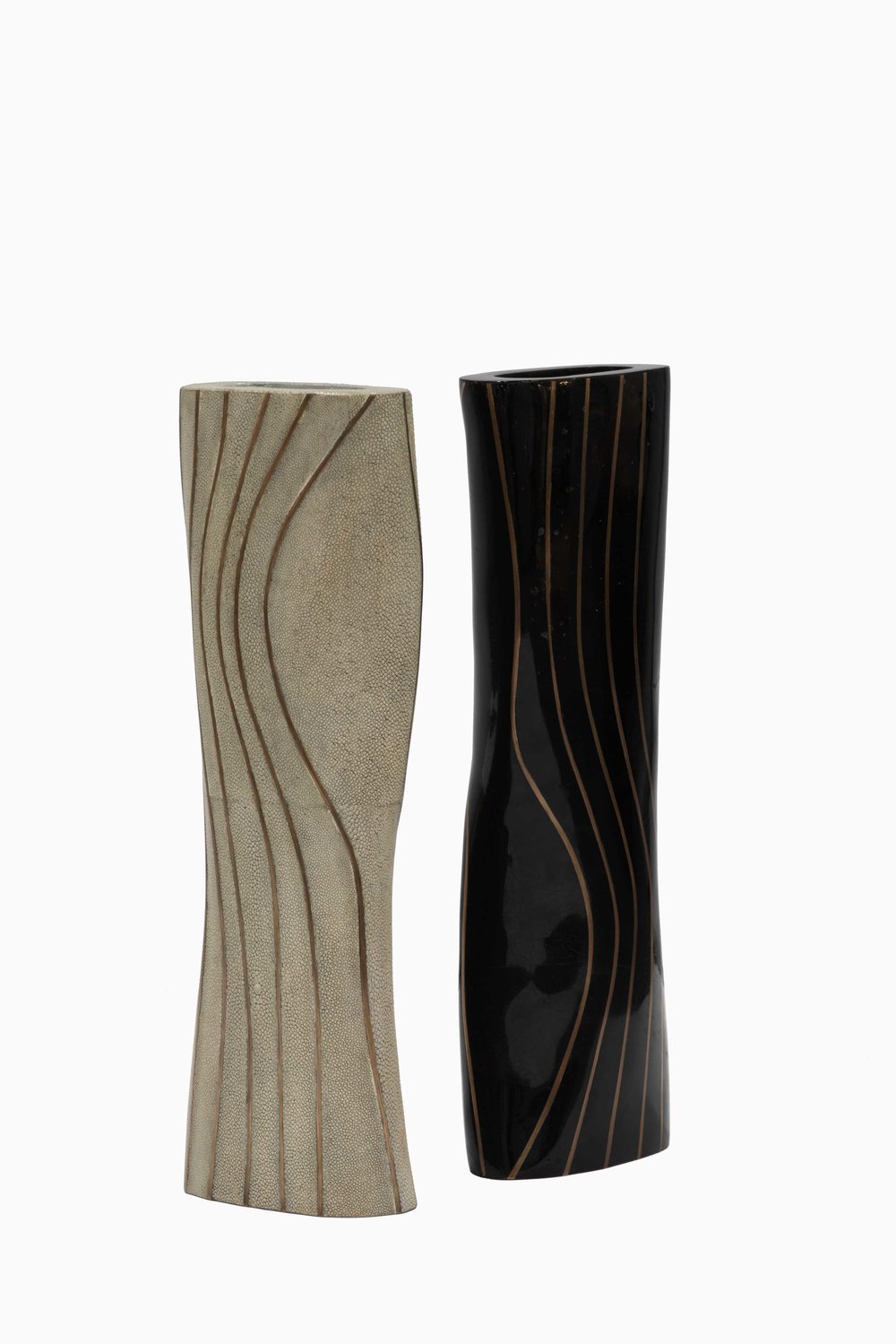 The Storm Vase is sleek and elegant with beautiful inlay detailing. Available in either black pen shell or antique natural shagreen.