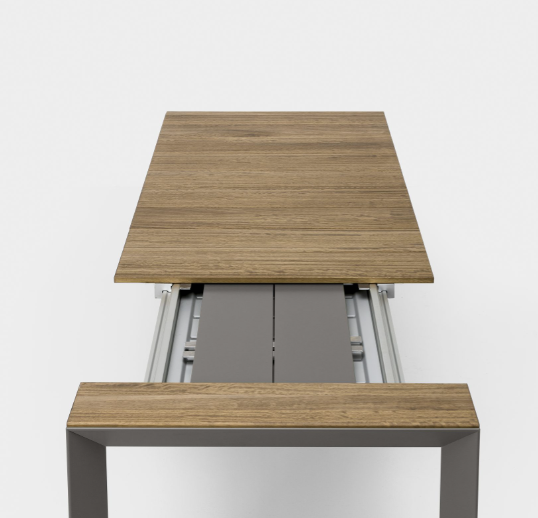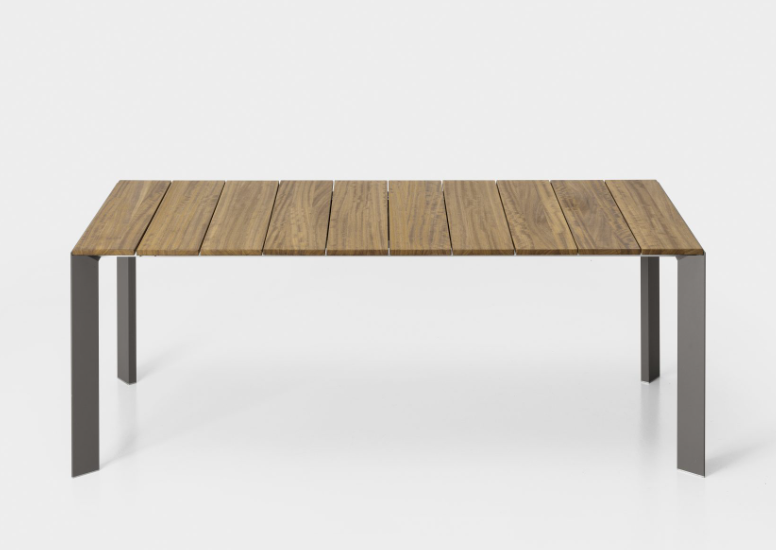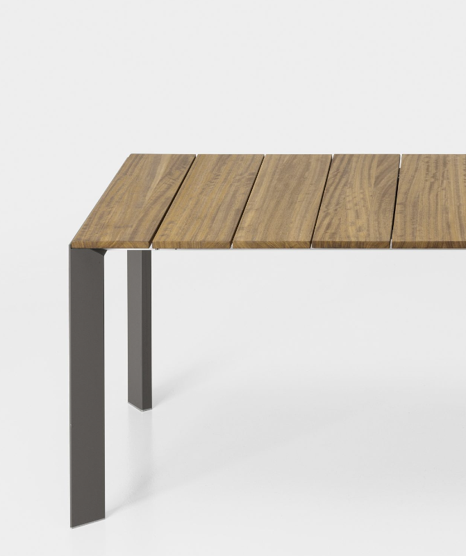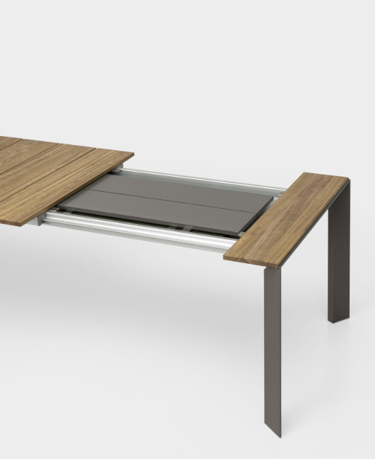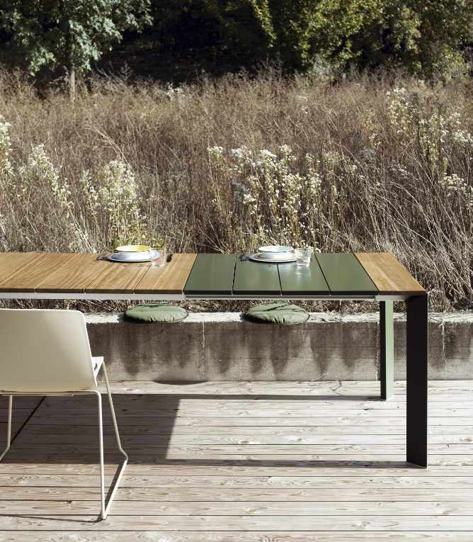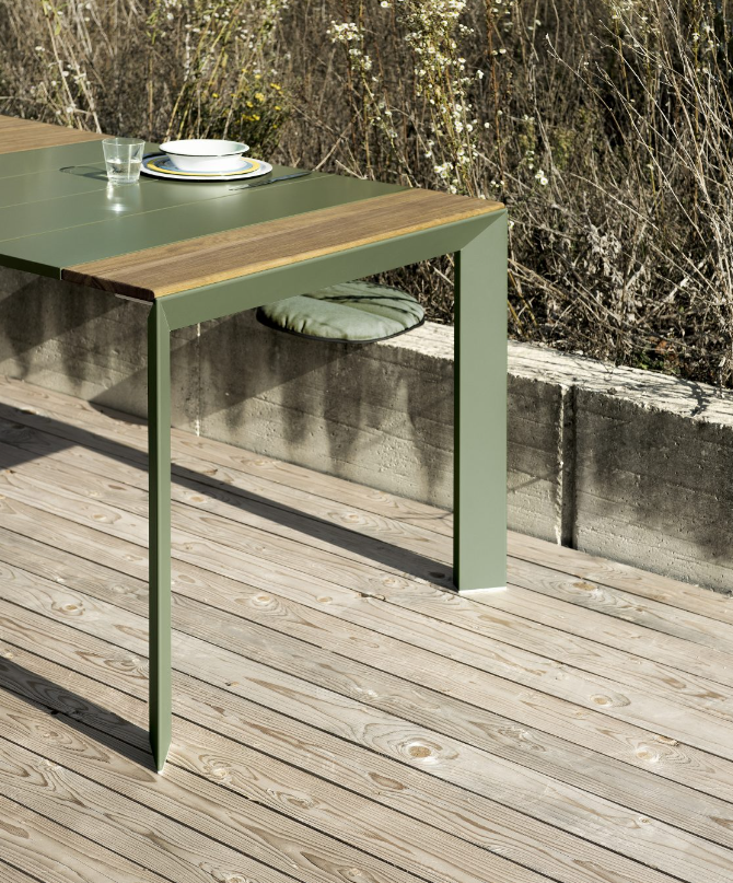 With their characteristic design, the legs of Nori tables are combined with a staved top made of Teak, FSC certified to respect the environment, which is 20 cm wide and 2 cm thick. The top can be left in its natural colour, since over time it acquires an unmistakable silvery shade, or it can be treated with oil to resume its original colour. It is also available with drawn aluminium extensions, housed in a special compartment.