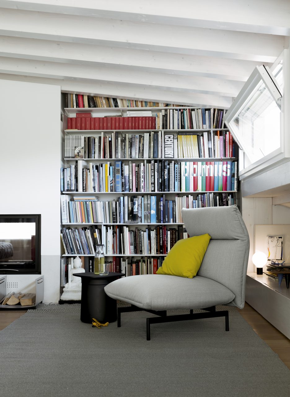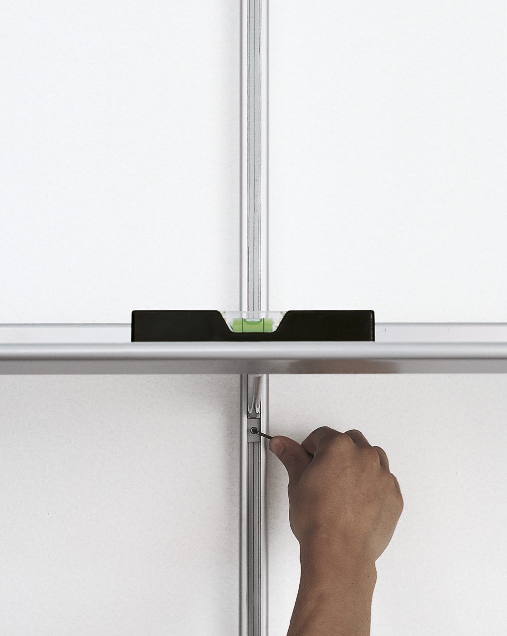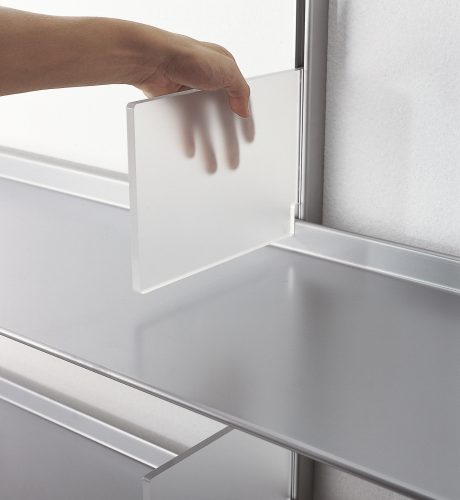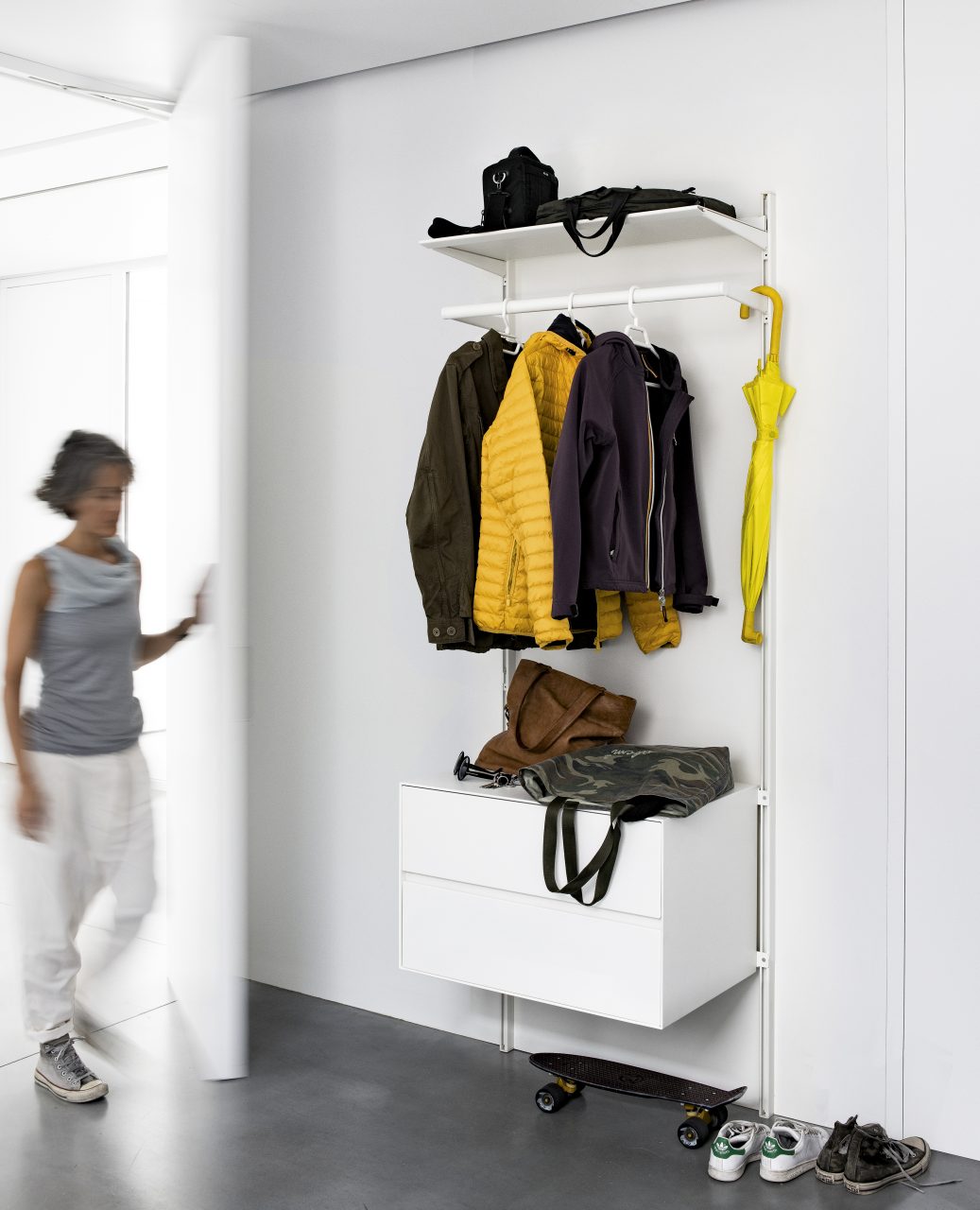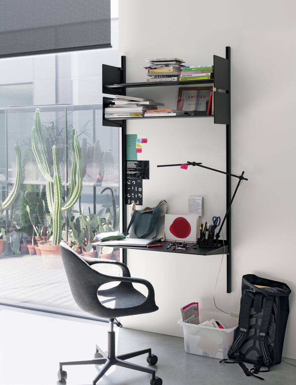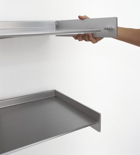 Dot is a versatile system designed to furnish any space in the home, a light design element consisting of a few simple components that can lead to a multitude of solutions. It comprises narrow painted sheet metal shelves and light extruded anodized aluminium uprights, available in six different sizes or custom-made. Accessories such as side panels, bookends, lighting tubes, clothes hooks and wall storage units provide many other options for use: from the living room, where Dot is a minimalist bookcase that almost disappears, to the kitchen, the home of?ce corner, the wardrobe and the closet at the entrance. This versatile design project helps you organise every room in the home, as you desire.