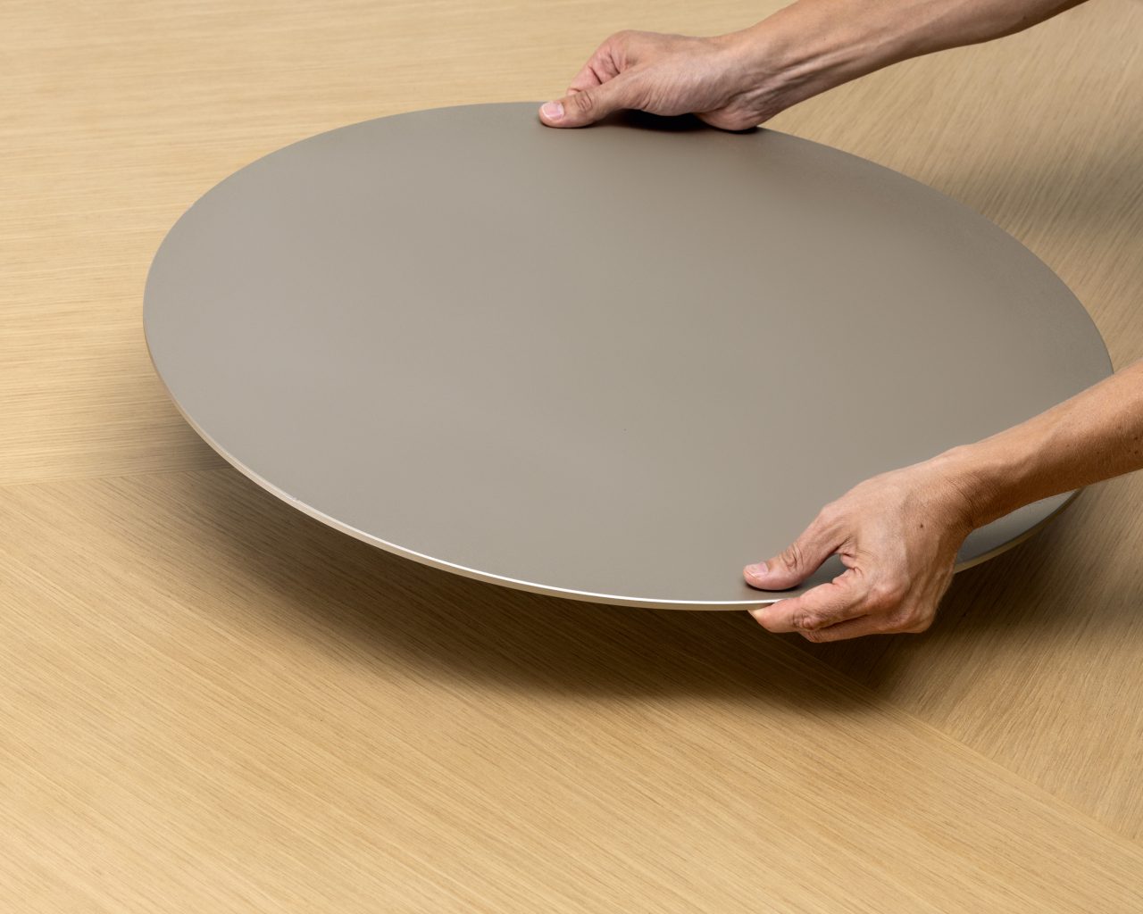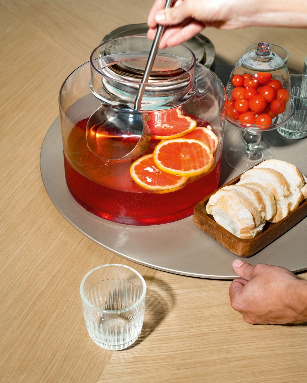 Nobody knows the origins of this accessory, a dumb waiter of the well-to-do American and European society in the early 20th century. It later became an essential accessory on meal tables in China, especially for dim sum. Now, the Kristalia Bluezone research lab has re-interpreted it with a minimalist twist, allowing it to combine both fluid movement with an ultra-contemporary appearance. Available in two sizes and various finishes, including the new “Exclusive colours”, Lazy Susan can be used on a tabletop. It is easy to remove and re-position even on a tablecloth.