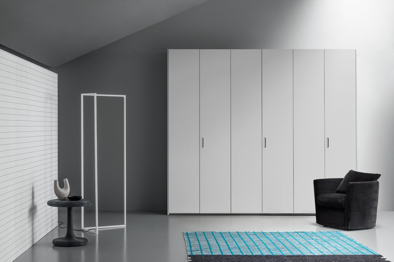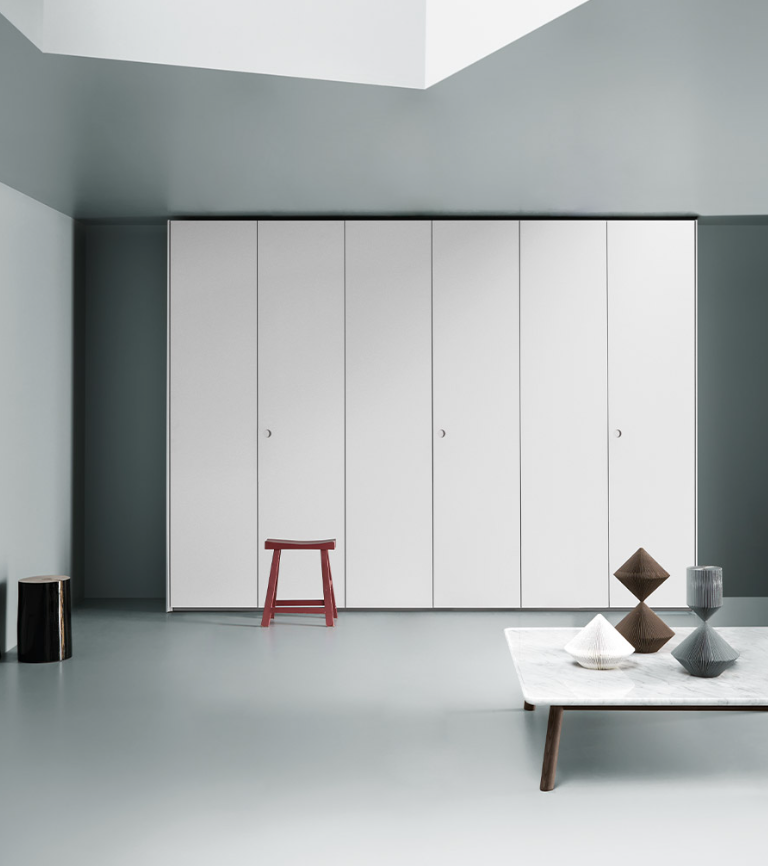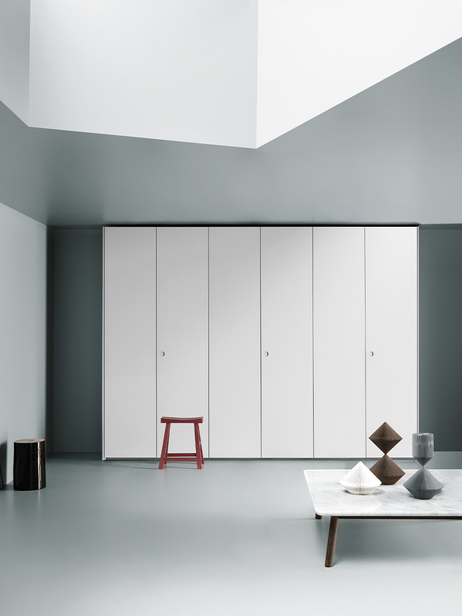 Aria is a wardrobe and walk-in wardrobe system that allows a combination of different units. The structure, with closed or through sides in Black or Bronze aluminium, can be closed by sliding or hinged doors in a choice of materials, also in aluminium with flush glass. Wardrobes and walk-in wardrobes can be fitted with suspended or floor-standing drawer units, storage racks, glass and aluminium pull-out shelves, boxes and customised accessory holders.