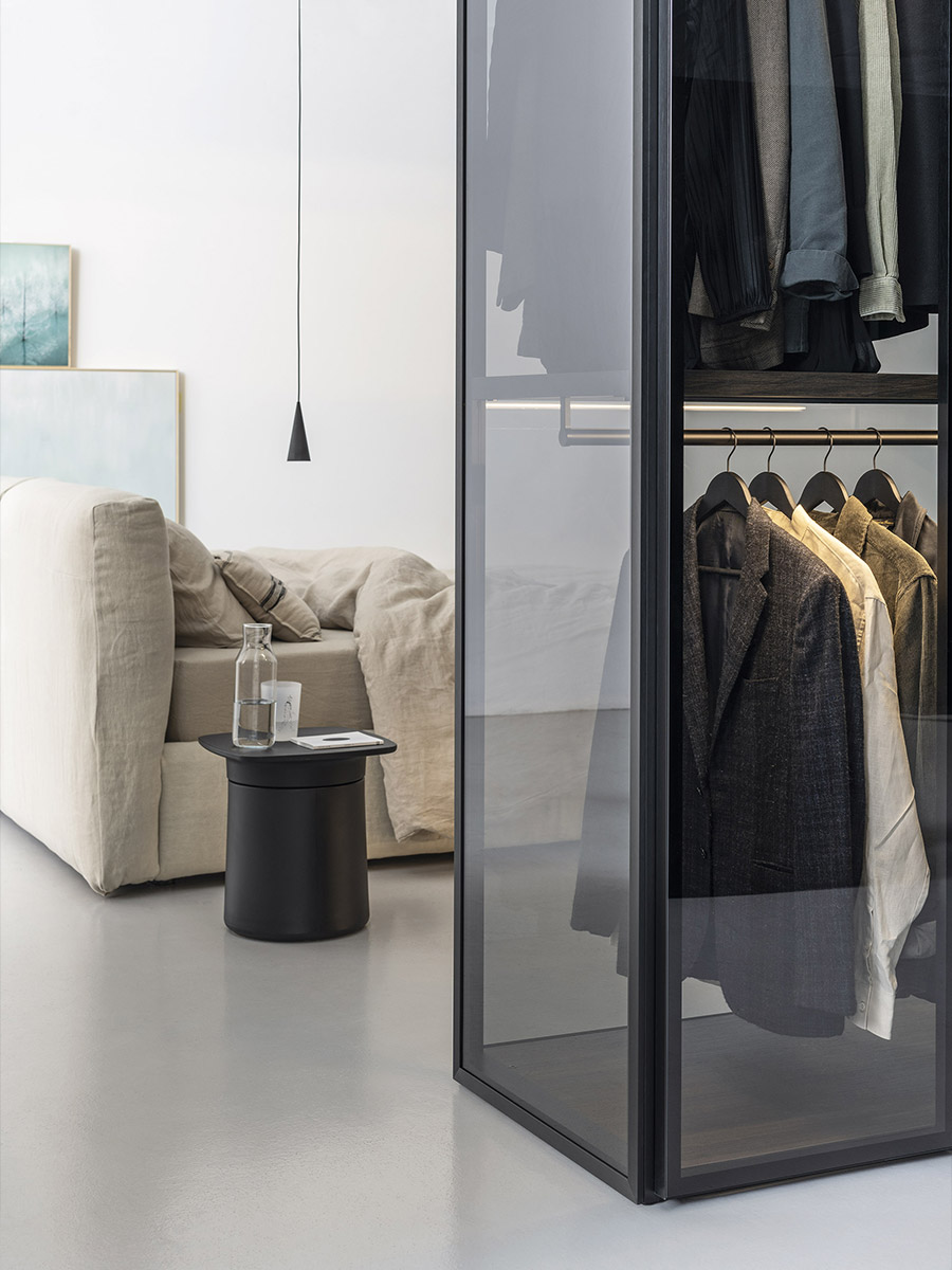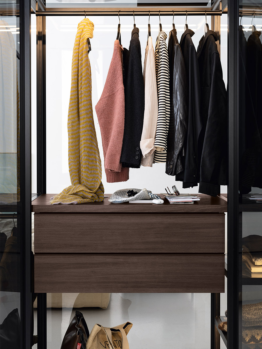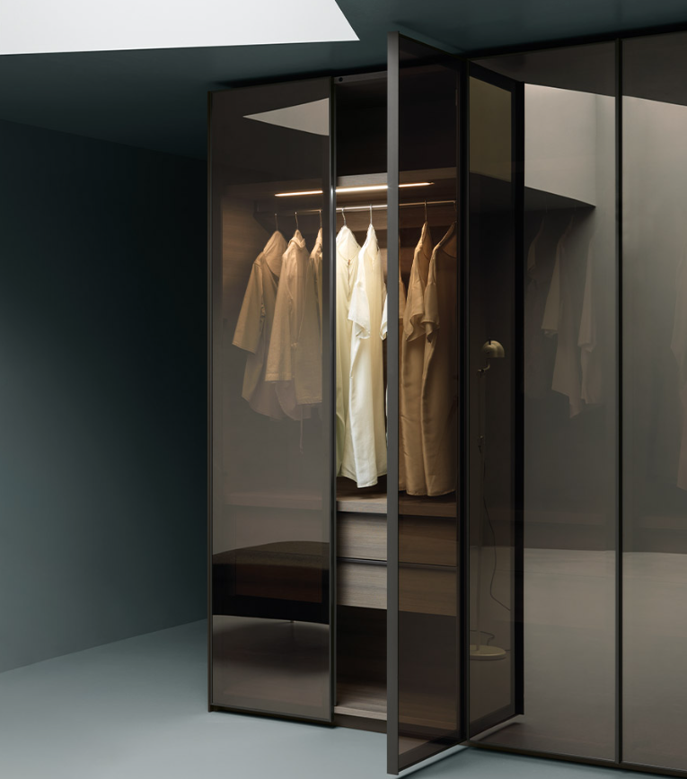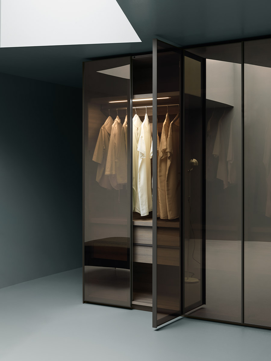Aria is a wardrobe and walk-in wardrobe system that allows a combination of different units. The structure, with closed or through sides in Black or Bronze aluminium, can be closed by sliding or hinged doors in a choice of materials, also in aluminium with flush glass. Wardrobes and walk-in wardrobes can be fitted with suspended or floor-standing drawer units, storage racks, glass and aluminium pull-out shelves, boxes and customised accessory holders.