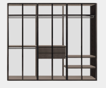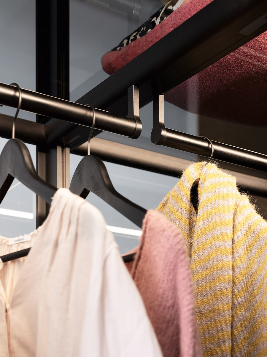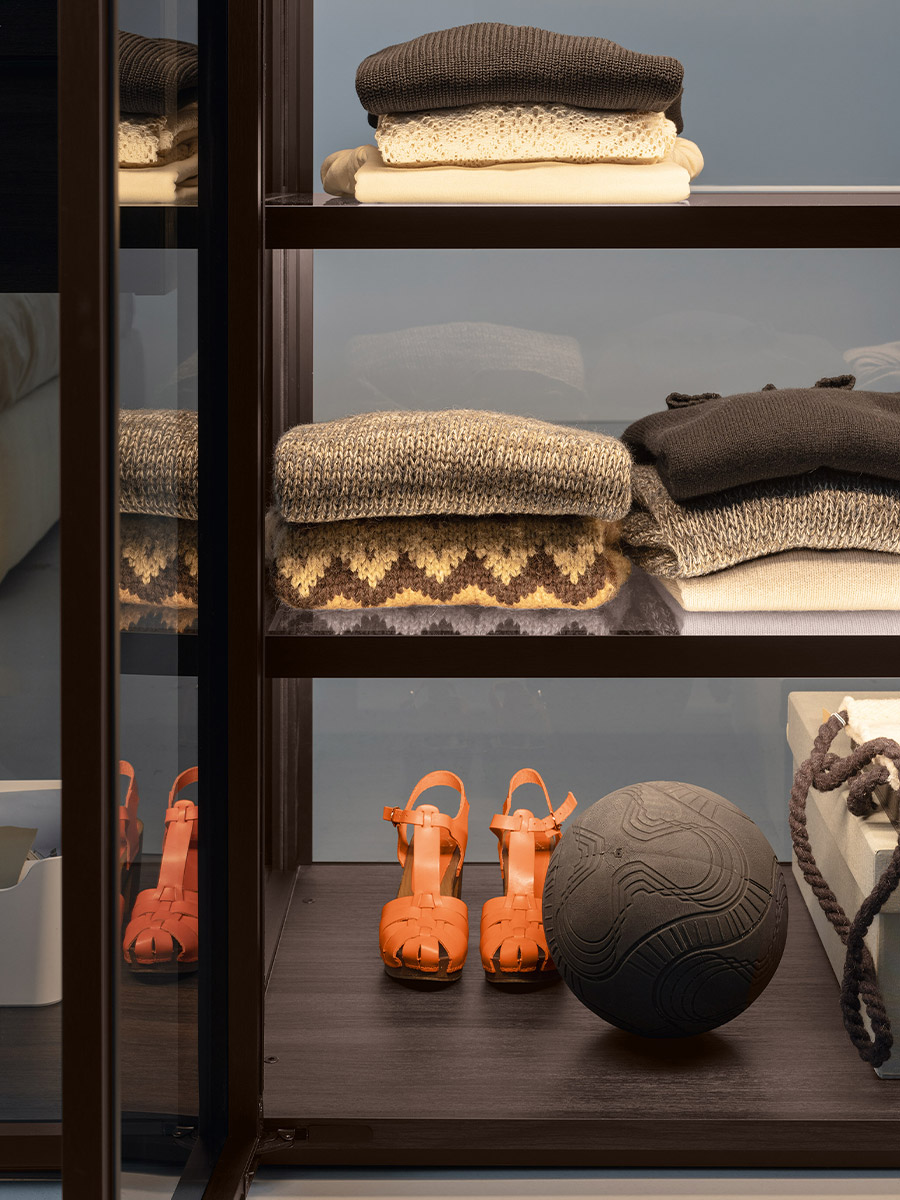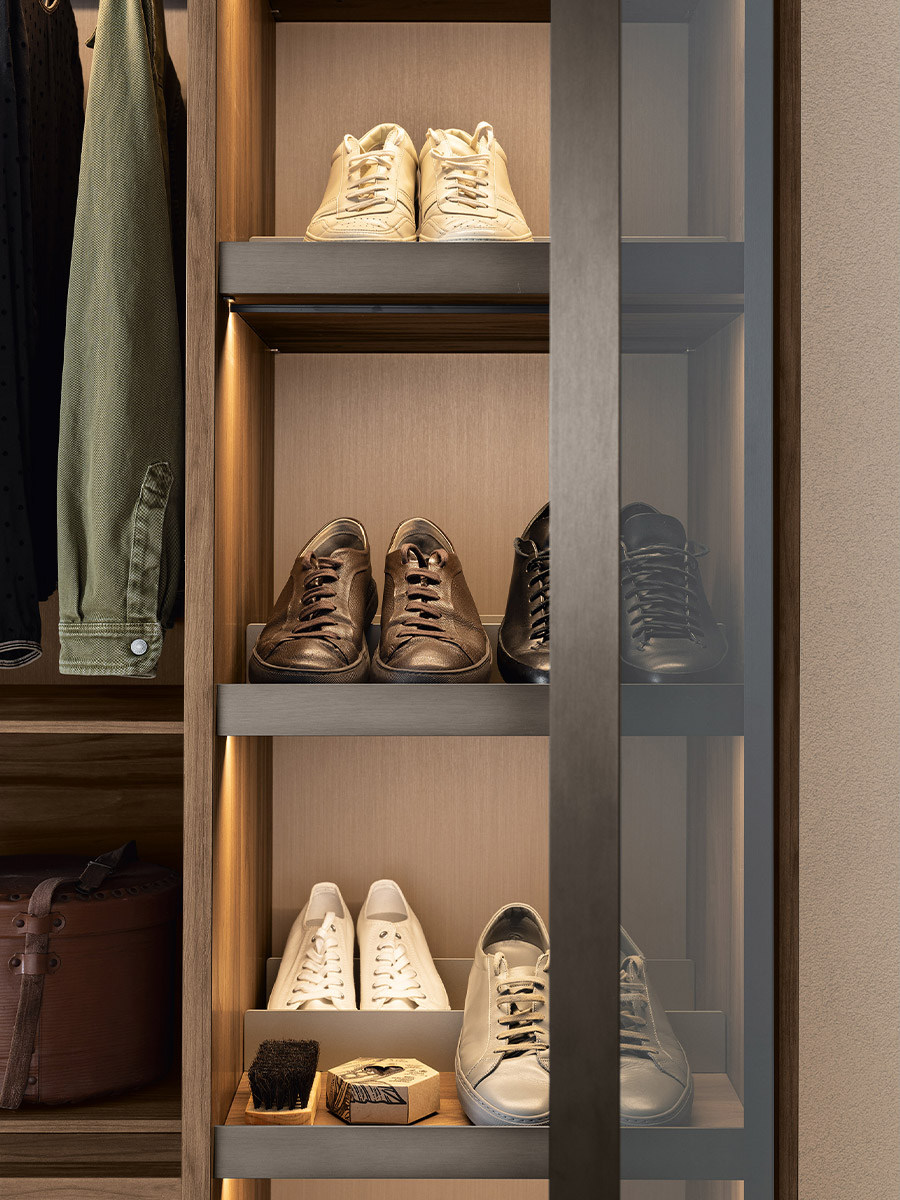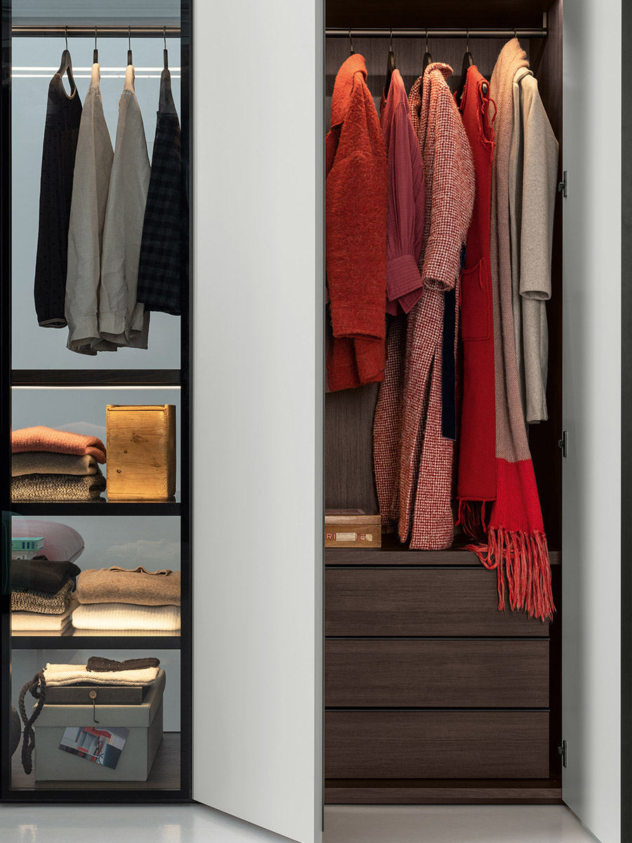 Aria is a wardrobe and walk-in wardrobe system that allows a combination of different units. The structure, with closed or through sides in Black or Bronze aluminium, can be closed by sliding or hinged doors in a choice of materials, also in aluminium with flush glass. Wardrobes and walk-in wardrobes can be fitted with suspended or floor-standing drawer units, storage racks, glass and aluminium pull-out shelves, boxes and customised accessory holders.