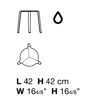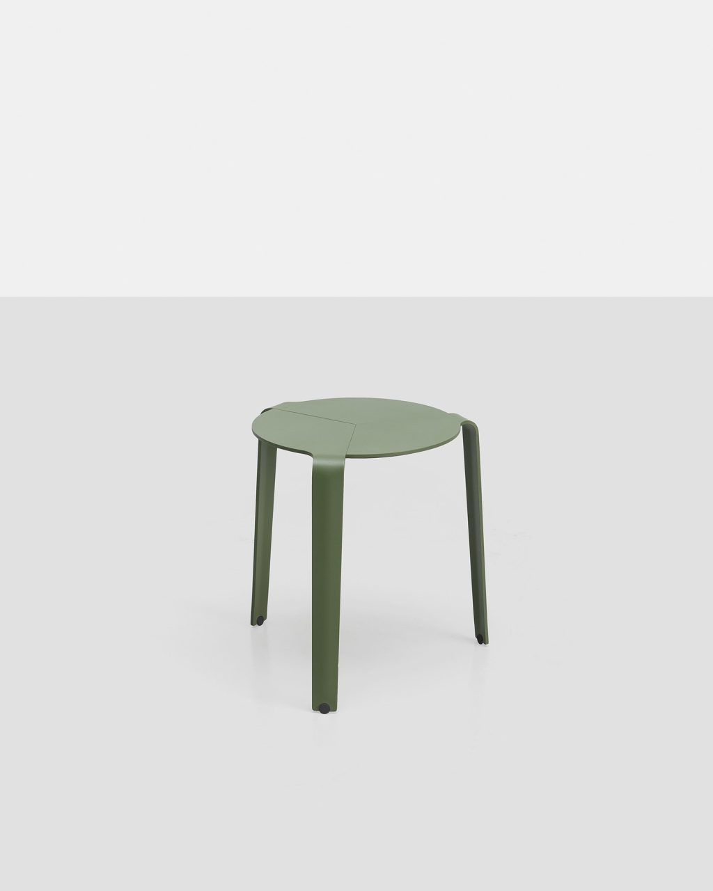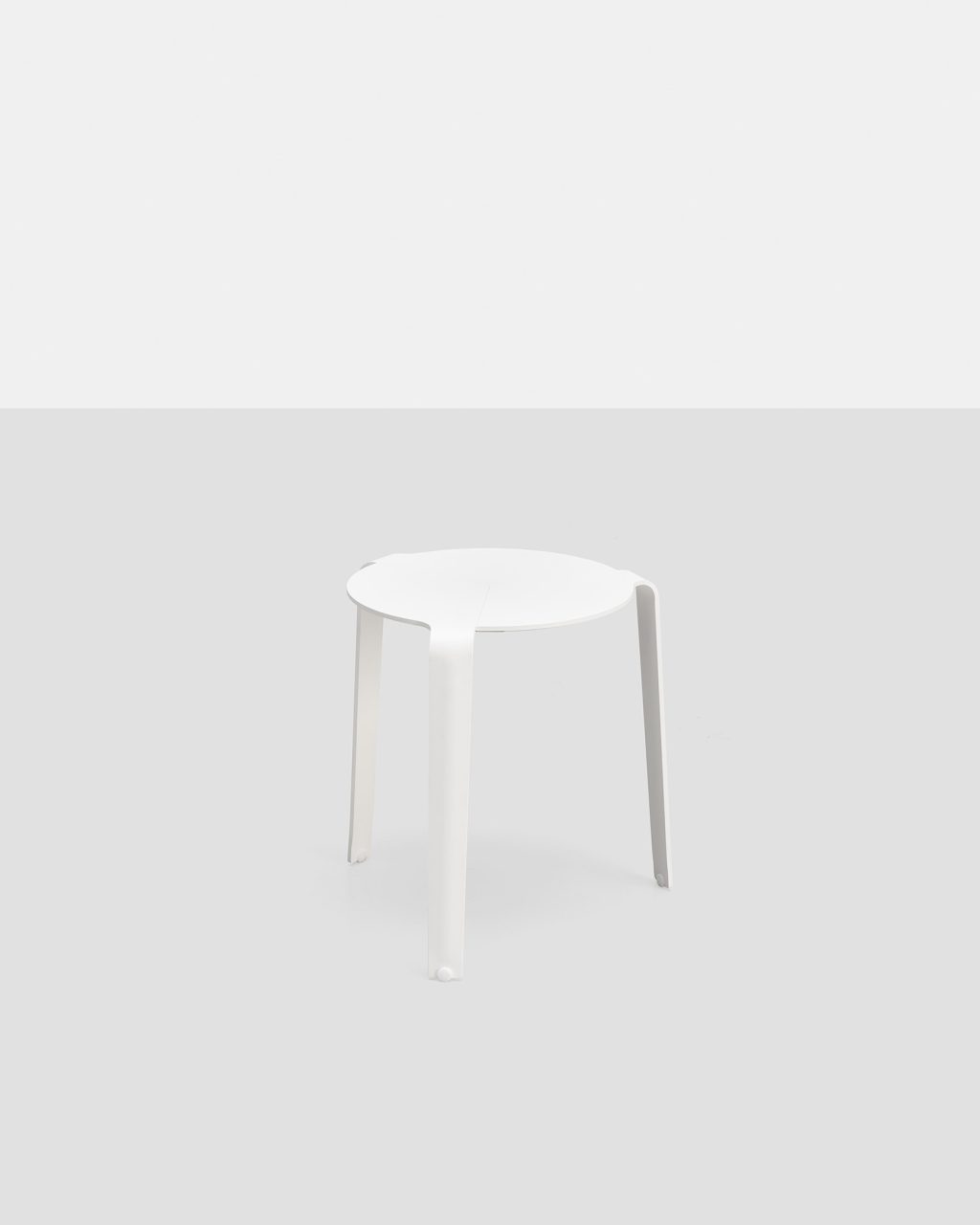 Tribute to Alvar Aalto. Reissue of the three-legged table/stool designed by Luciano Bertoncini in 2012, made entirely of aluminium and stackable up to 10 pieces. Suitable for outdoor and indoor environments.