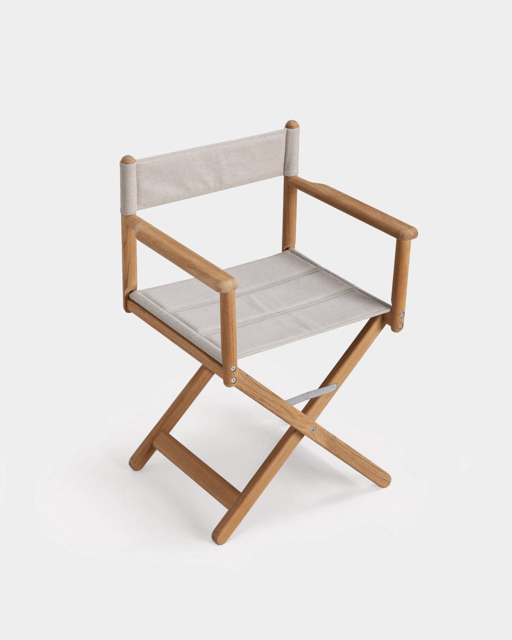 The timeless elegance of this chair arises from the reinterpretation of teak slats, which acquire soft, rounded shapes. The folding director’s version has lightly padded upholstery.