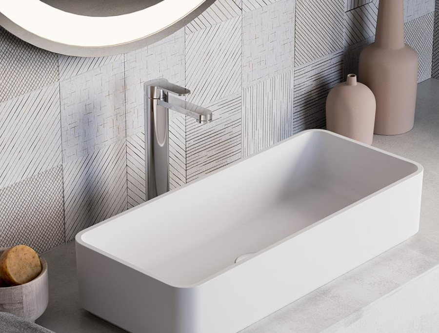 Countertop rectangular washbasin in matt colored Mineralmarmo or in matt white Solid Surface, with possibility of external Colour finish, glossy or matt.