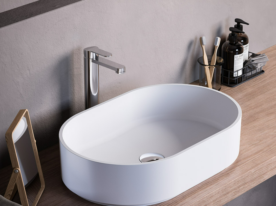 Countertop oval washbasin in matt colored Mineralmarmo or in matt white Solid Surface, with possibility of external Colour finish, glossy or matt.