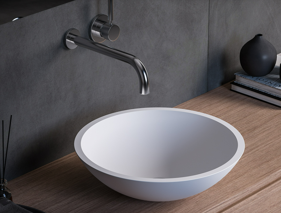 Countertop round washbasin in matt white Solid Surface, with possibility of external Colour finish, glossy or matt.