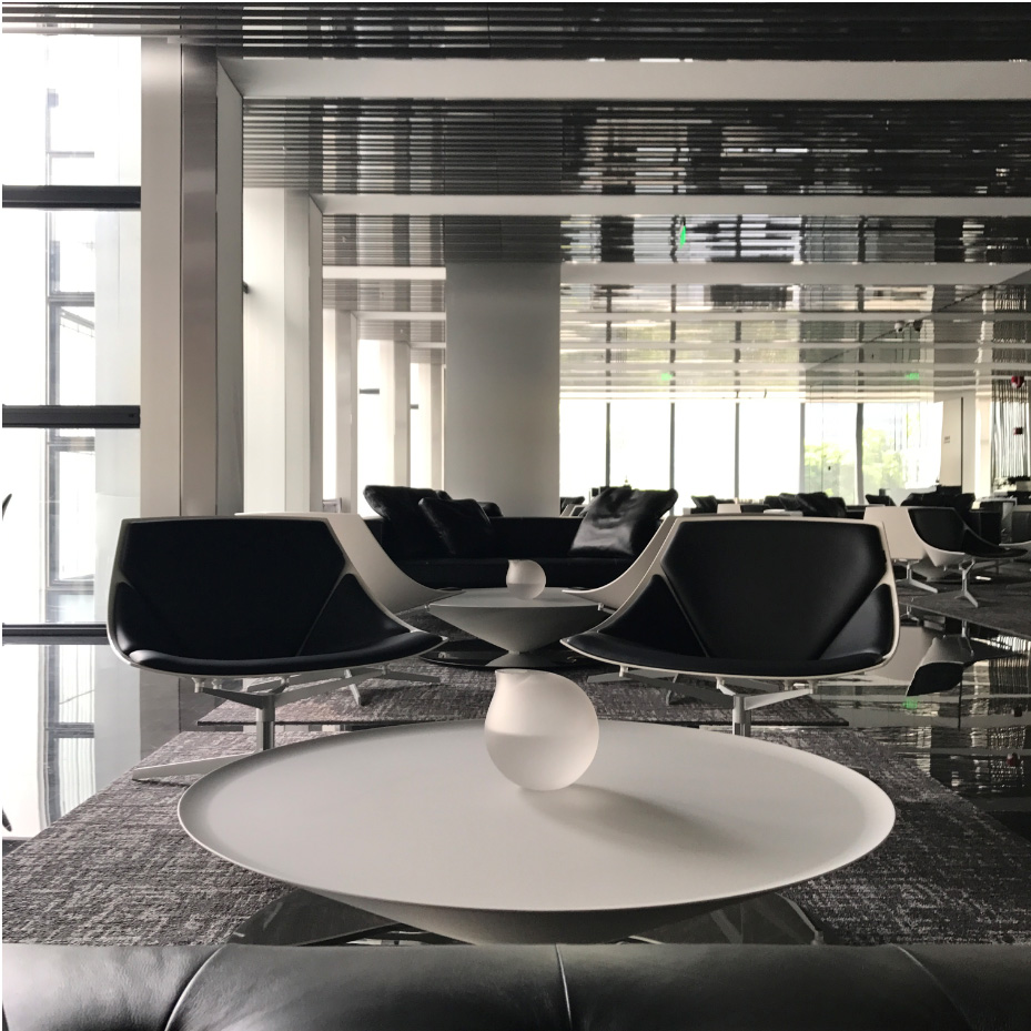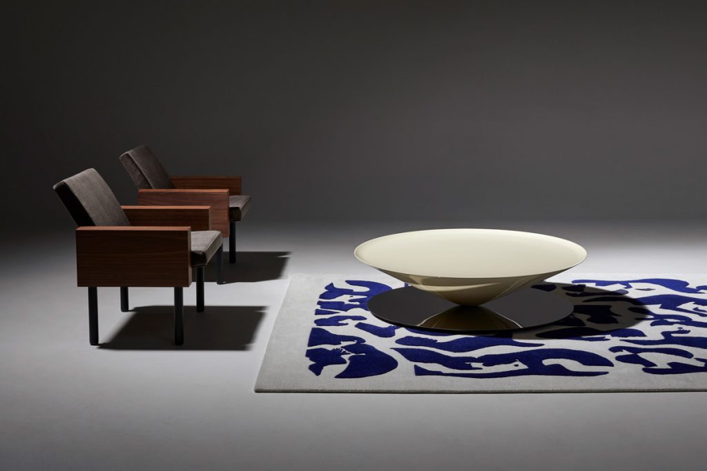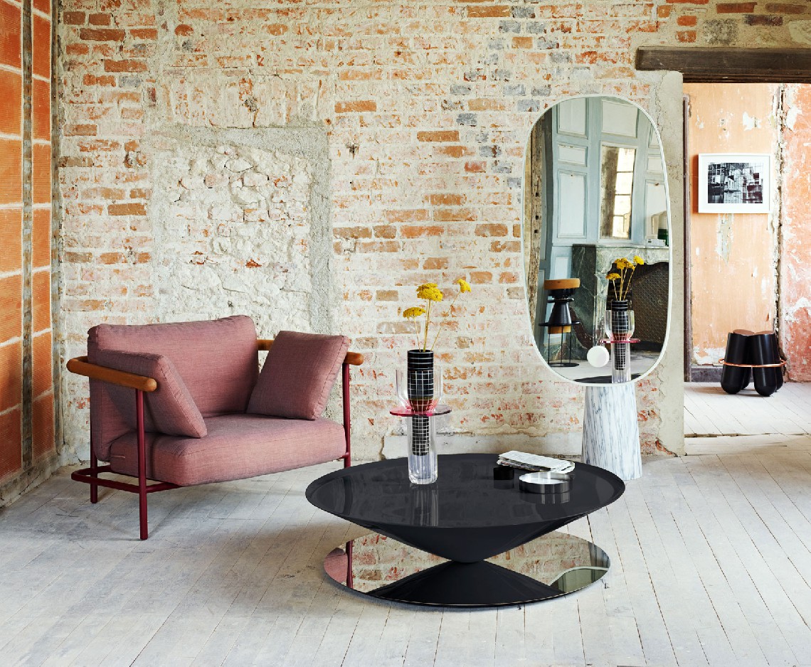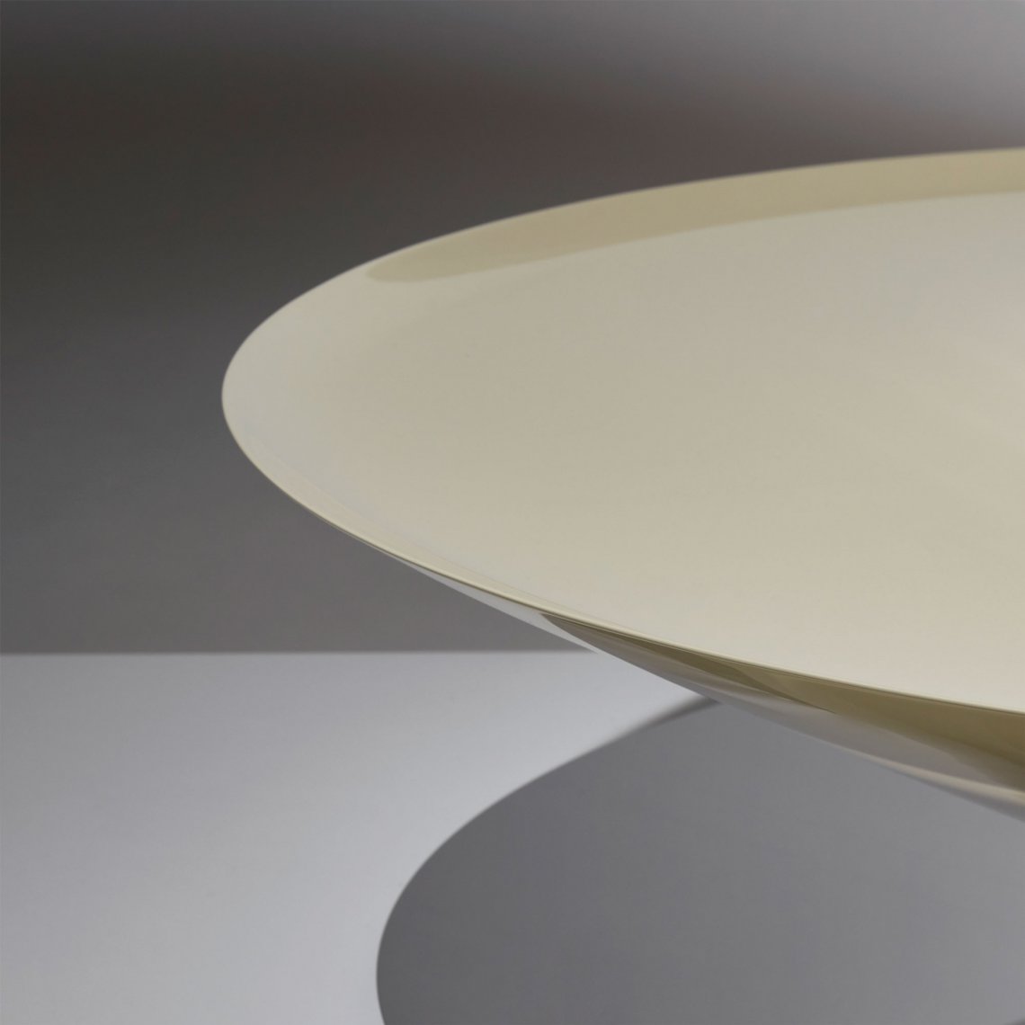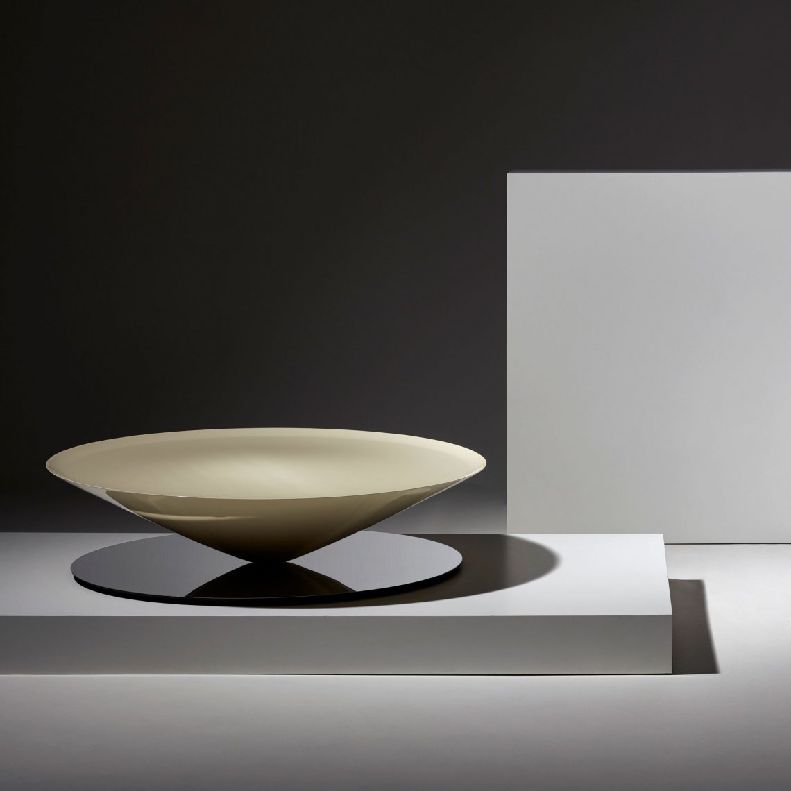 Float is a sculptural coffee table that challenges senses and perception. A massive metal cone apparently floats above a mirror polished steel base.
