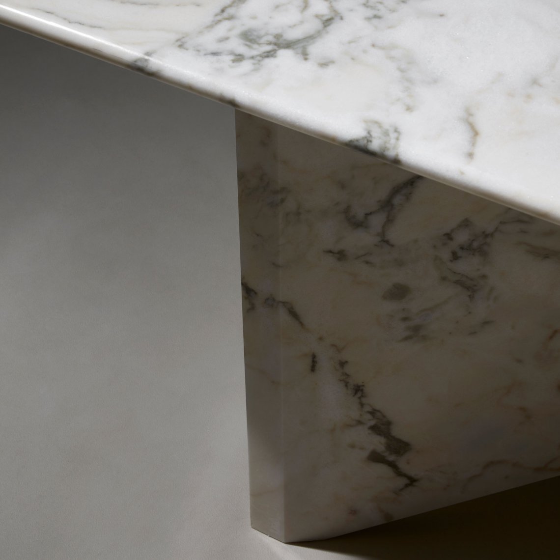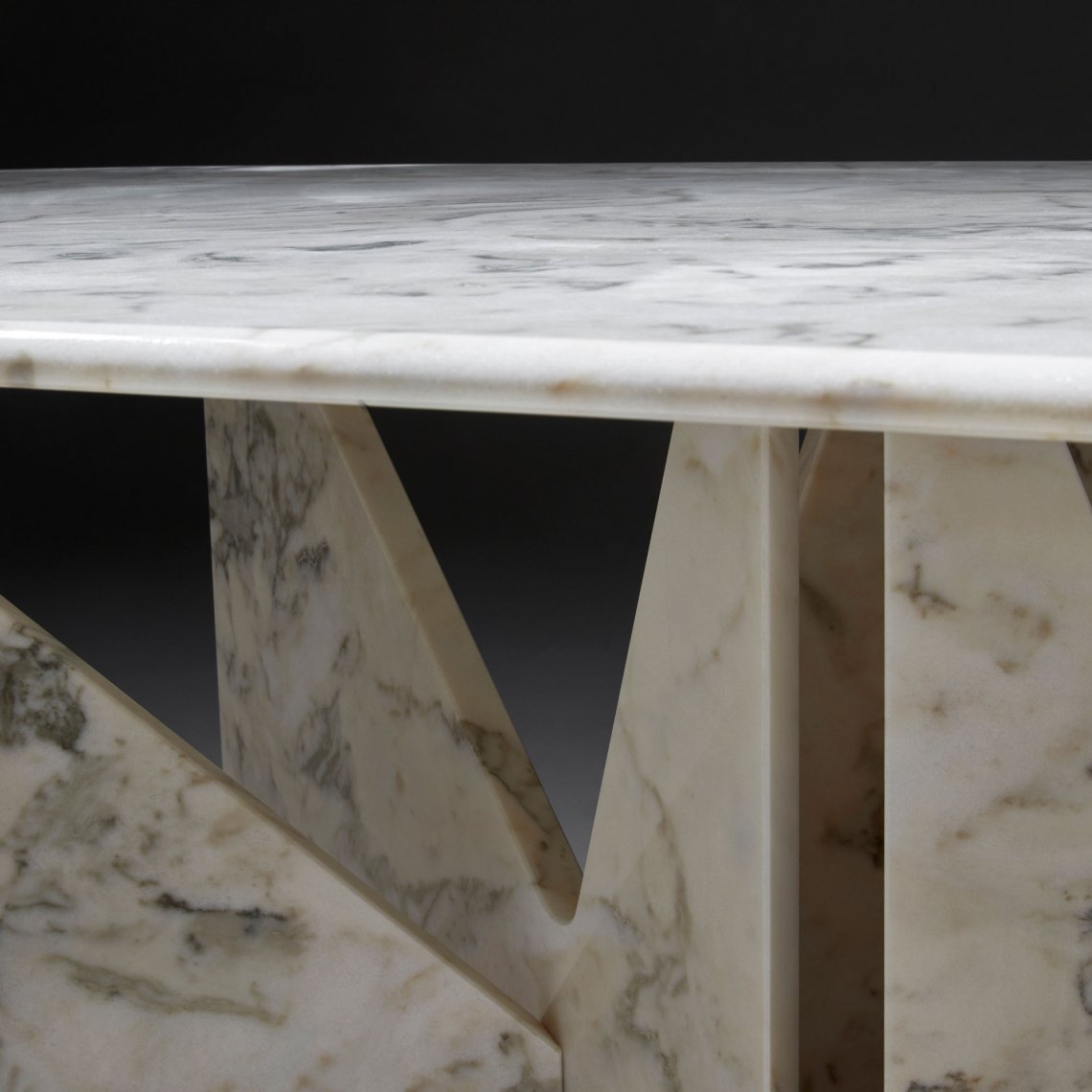Lamina is a dinner table relying on the intersection of marble slabs. The interlocking triangle shaped legs give it both a sense of equilibrium and dynamism.