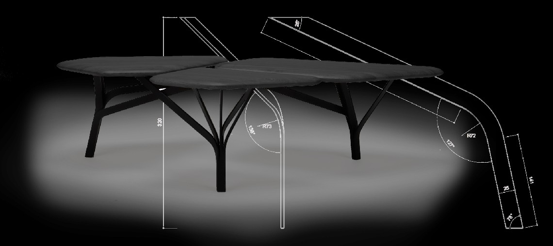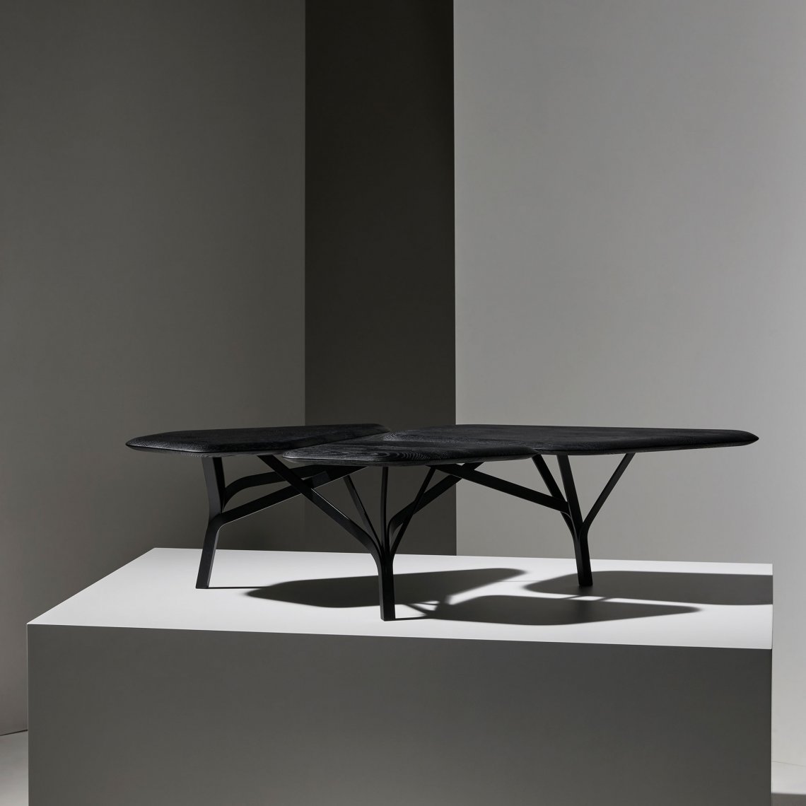 The Borghese table, as the eponymous sofa, is inspired by the umbrella pines at the Villa Borghese gardens in Rome. The characteristic network of branches is translated as a graphic steel framework supporting a trio of solid wood tops.