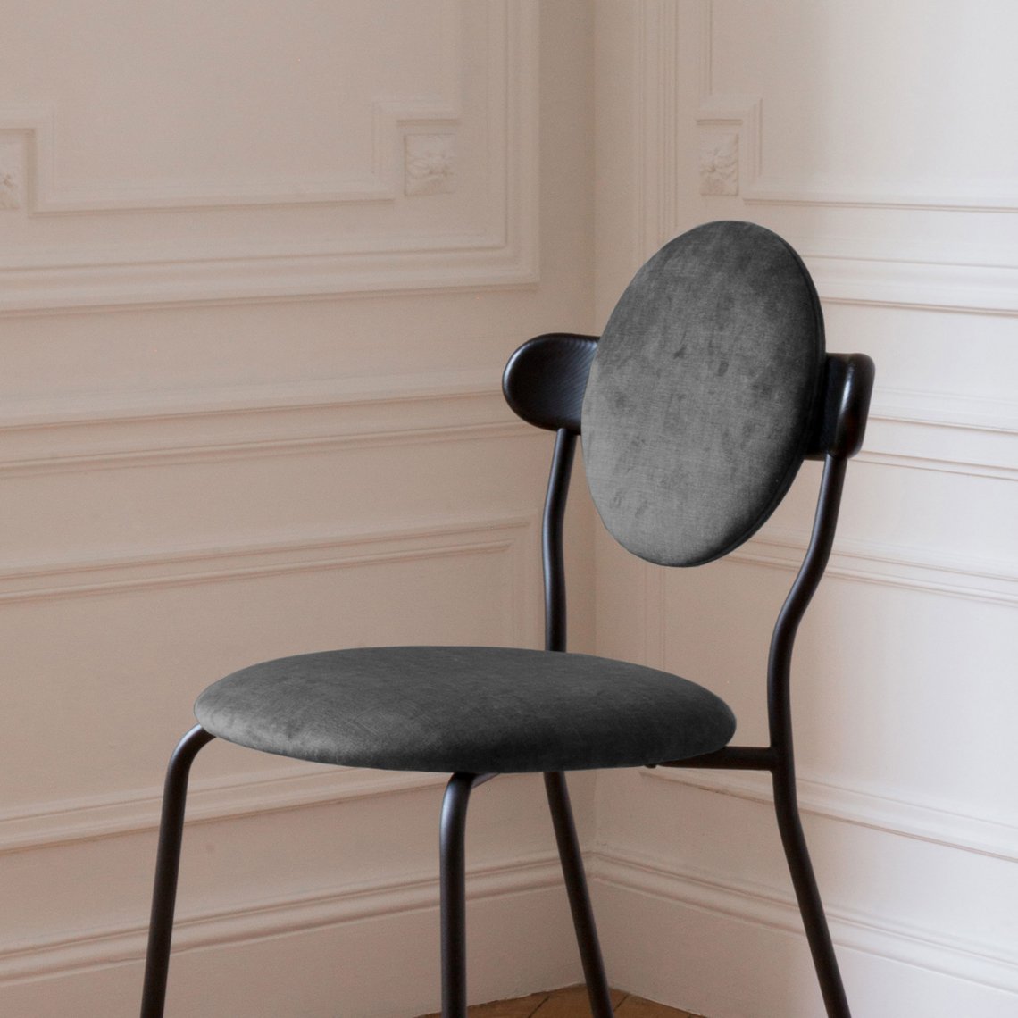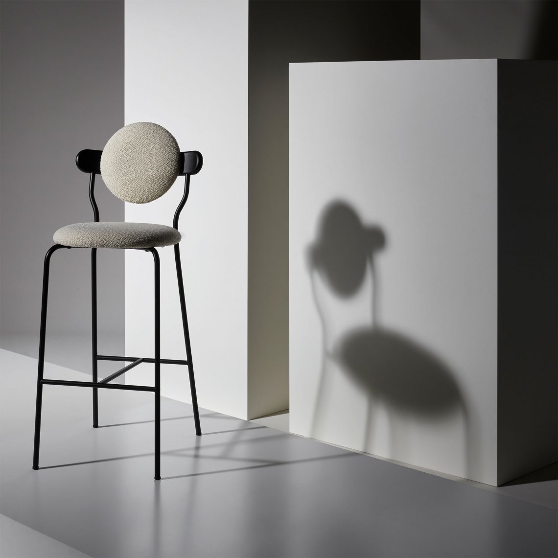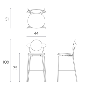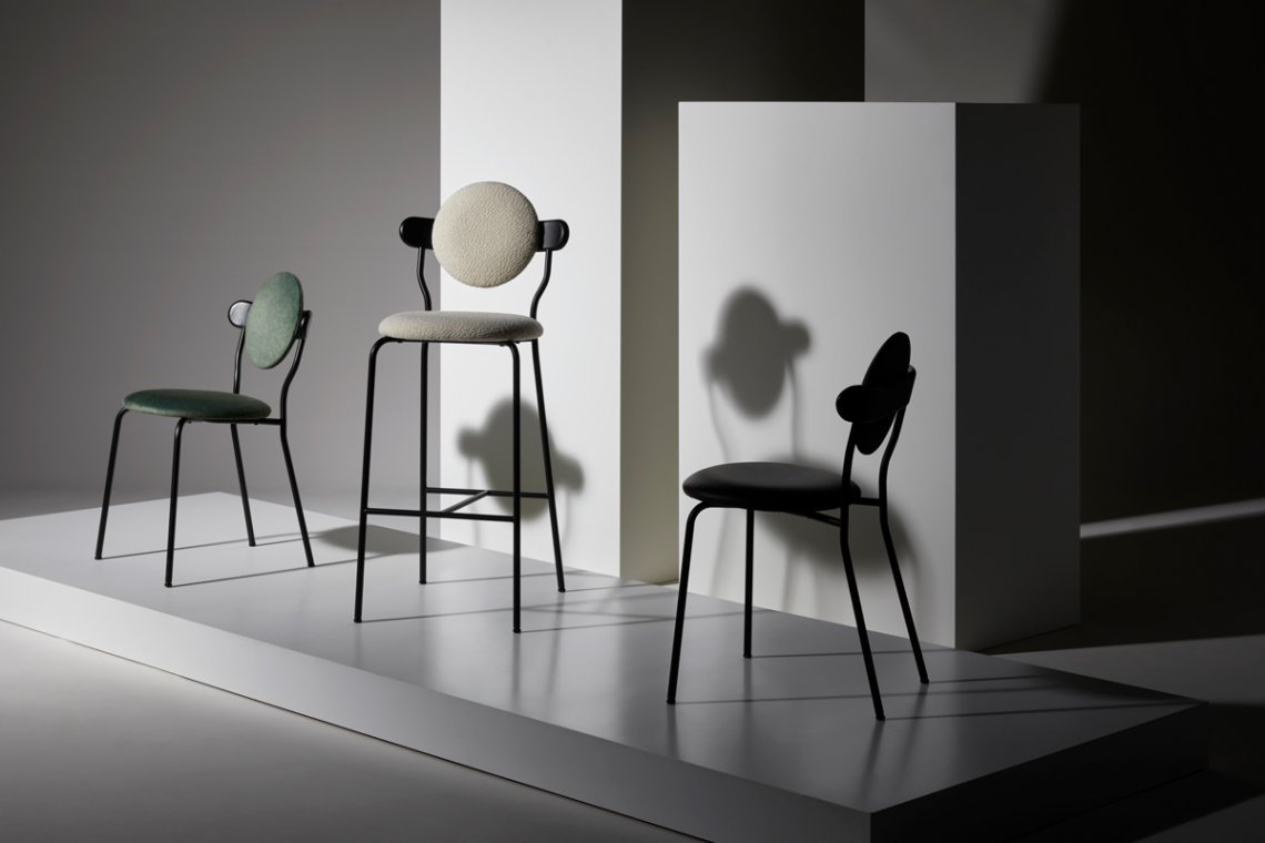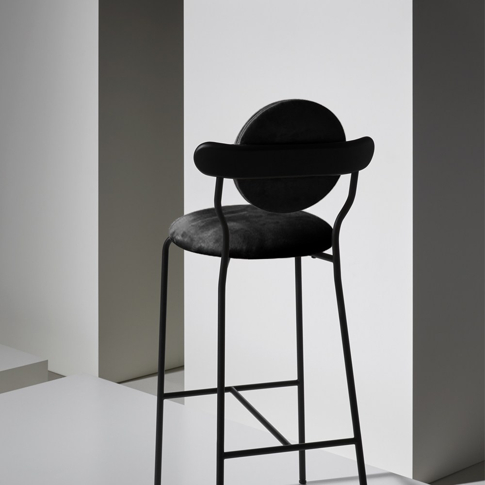 Planet bar is an upholstered high chair inspired by the distinctive silhouette of planet Saturn. The bar version of the original Planet chair offers a comfortable and practical solution to seat at the bar while keeping the same distinctive style.